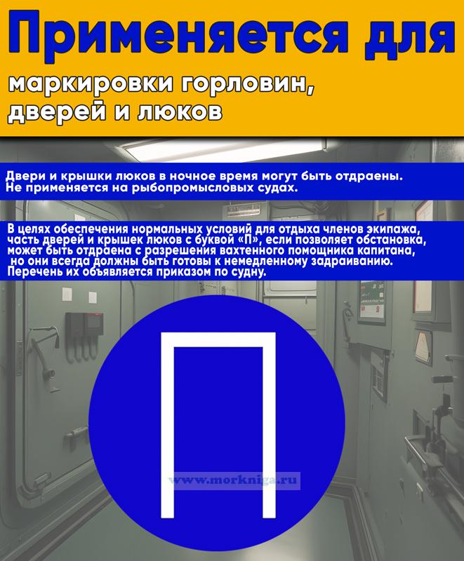 Трафарет применяется для маркировки горловин, дверей и люков. В ночное время могут быть отдраены. Не применяется на рыбопромысловых судах.