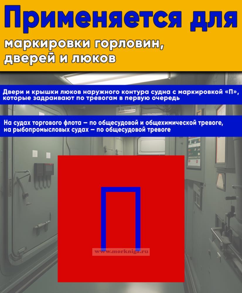 Трафарет применяется для маркировки горловин, дверей и люков наружного контура судна маркировкой «П», которые задраивают по тревогам в первую очередь. Синяя буква на фоне красного квадрата