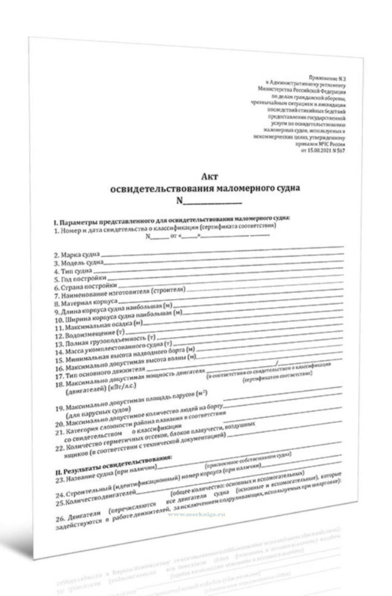 Форма Акта освидетельствования маломерного судна соответствует Приложению N 3 к Приказу МЧС России от 15.08.2021 N 567 "Об утверждении Административного регламента Министерства Российской Федерации по делам гражданской обороны, чрезвычайным ситуациям и ликвидации последствий стихийных бедствий предоставления государственной услуги по освидетельствованию маломерных судов, используемых в некоммерческих целях".