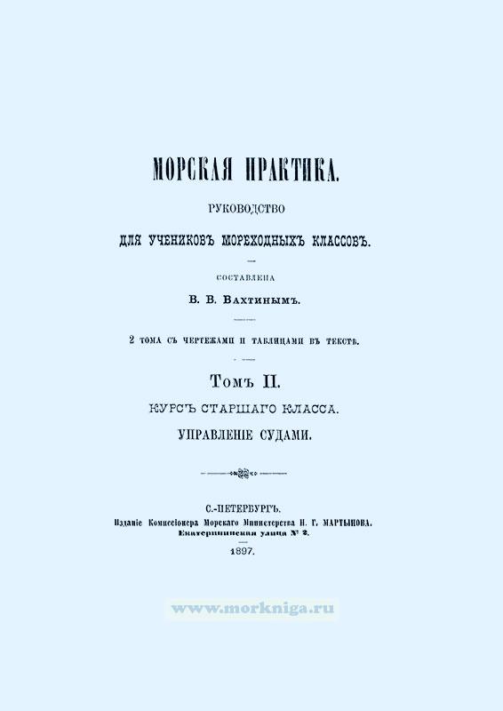 Лучшим руководством по «морской практике» служит сама практика, приобретенная плаваниями. Ни одна книга не в состоянии дать такого обширного и разнообразного материала по морскому делу, какой представляет каждому моряку вполне вооруженное судно, на котором, наглядно, можно изучить все подробности вооружения рулем и управление самим судном. Но, во-первых, не каждому ученику и даже помощнику шкипера может представится случай самому управлять судном при всех разнообразных условиях, а во-вторых, сами суда не сходны между собой ни по вооружению, ни по роду двигателя.
