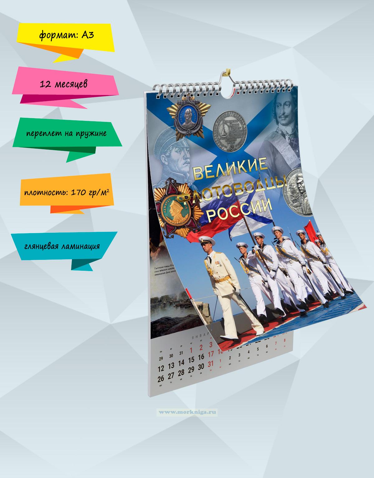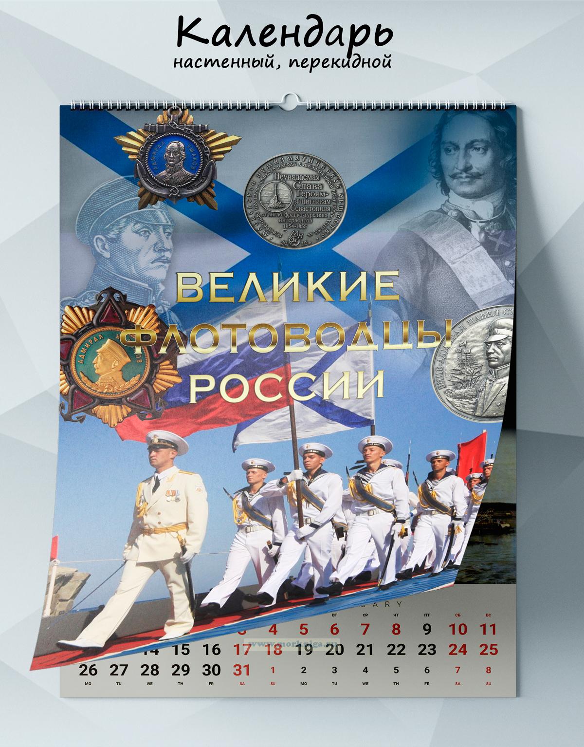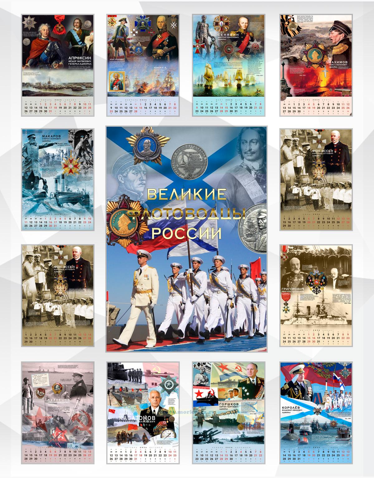 Календарь содержит 12 изображений великих флотоводцев России с краткой биографией: