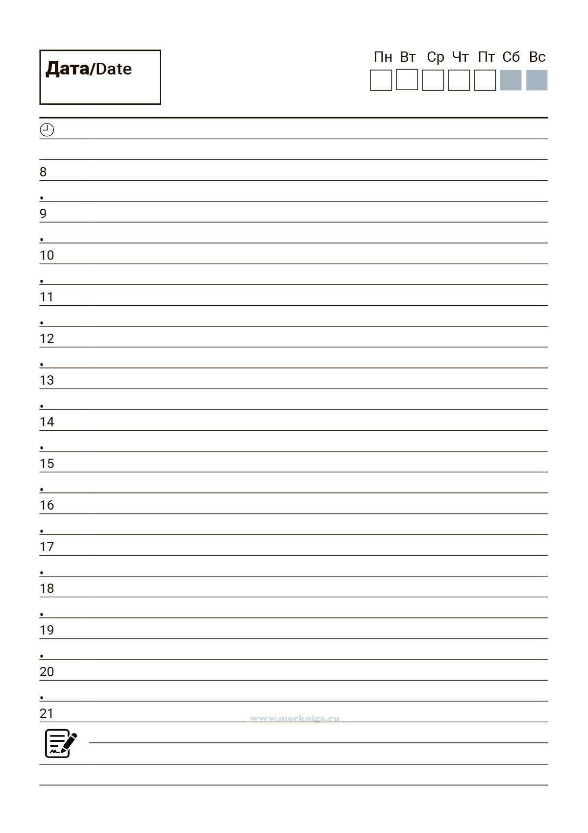 На обложке ежедневника изображен герб Военно-морского флота РФ. Каждая страница содержит поле для даты, дня недели и пустые пронумерованные строки для составления расписания на день, ведения заметок во время совещаний, формирования списка неотложных дел.