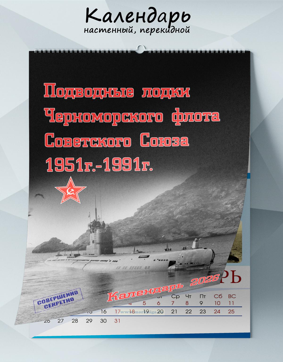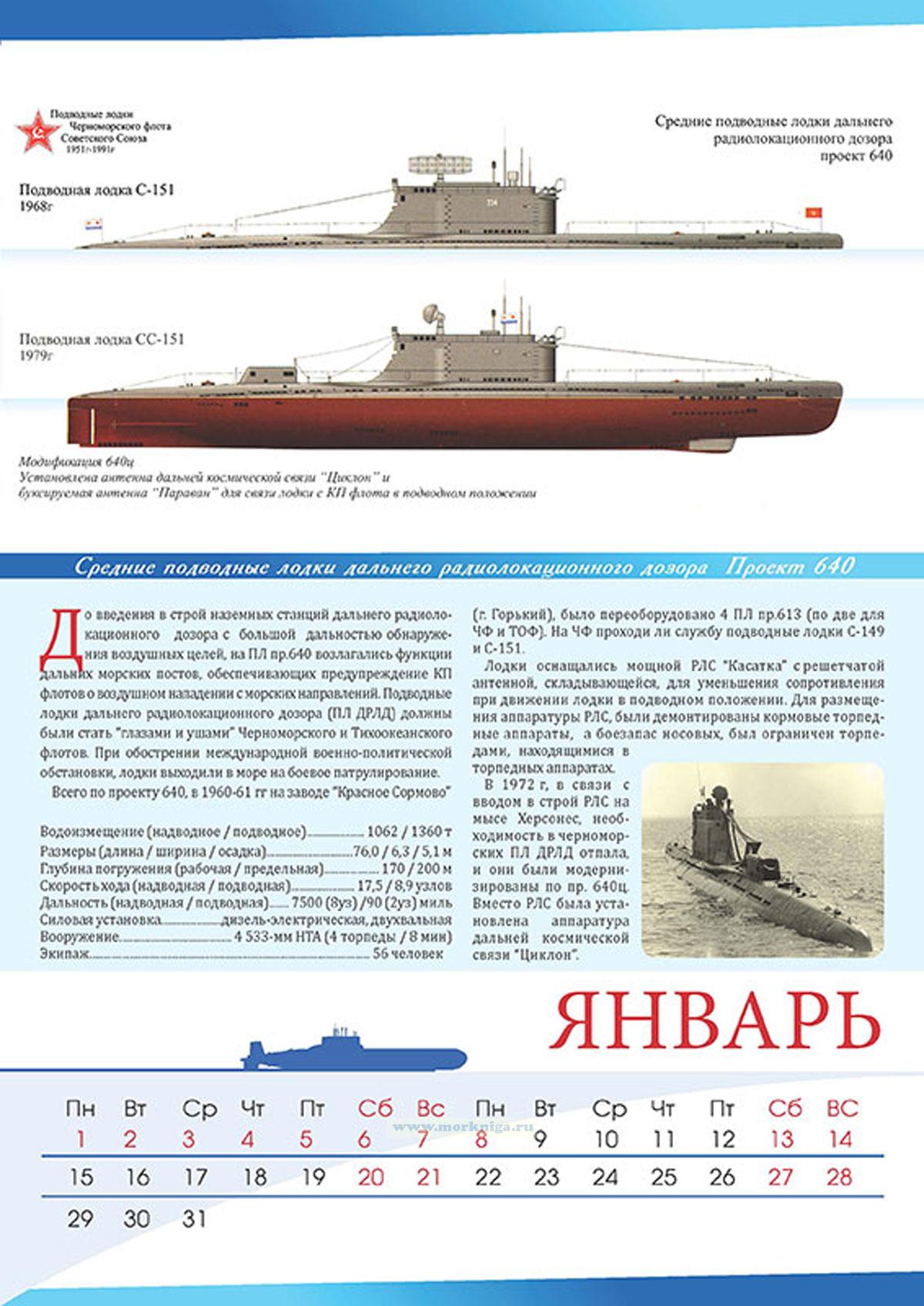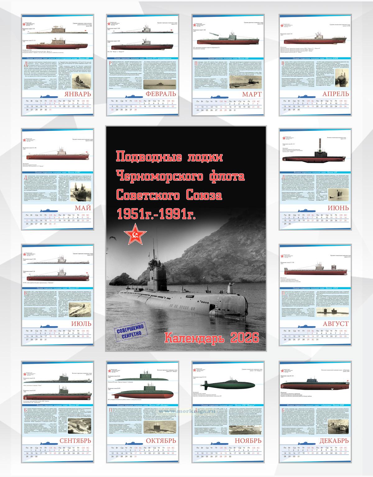 Календарь содержит изображения и краткую информацию о подводных лодках Черноморского флота Советского Союза 1951-1991 гг.: