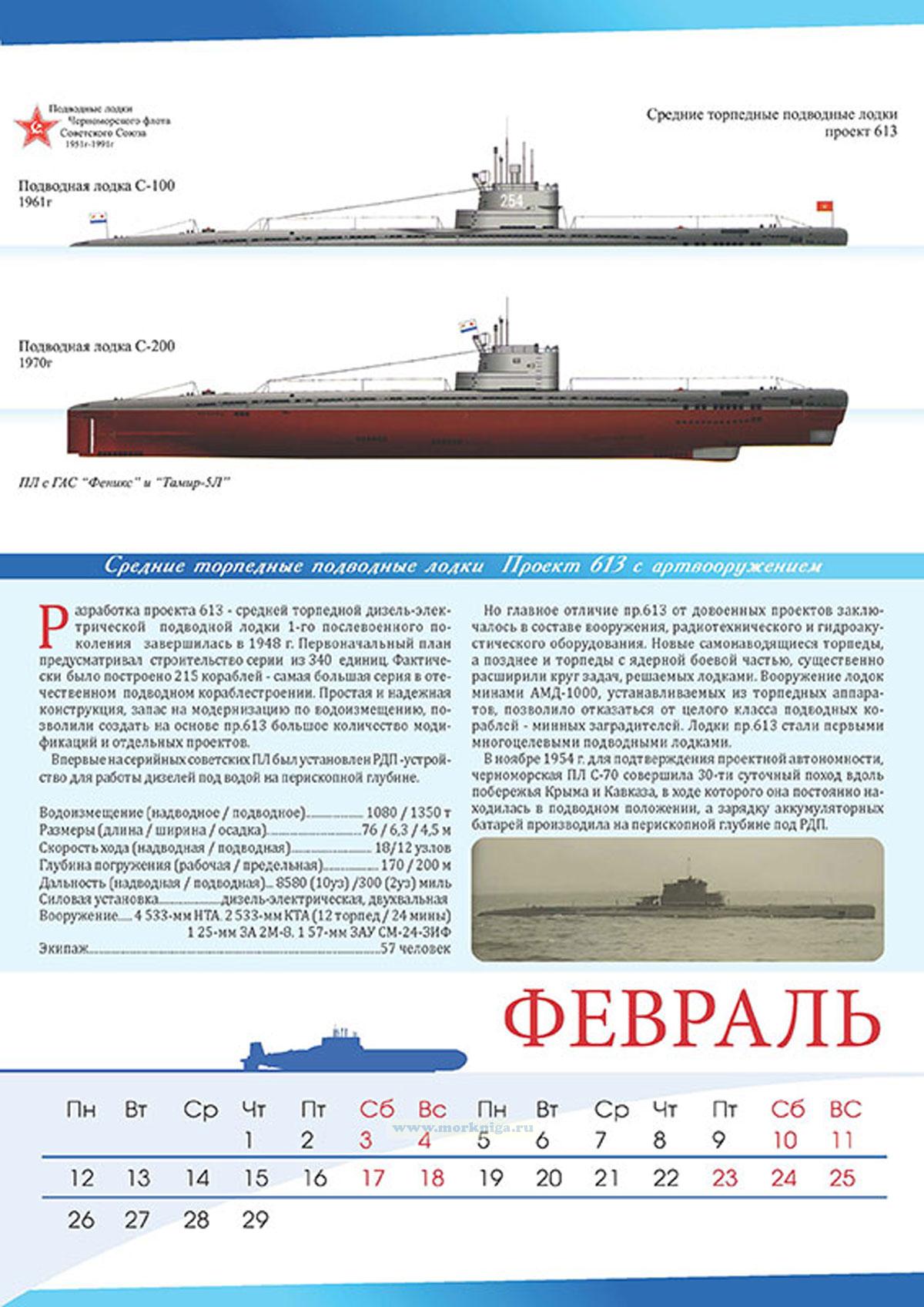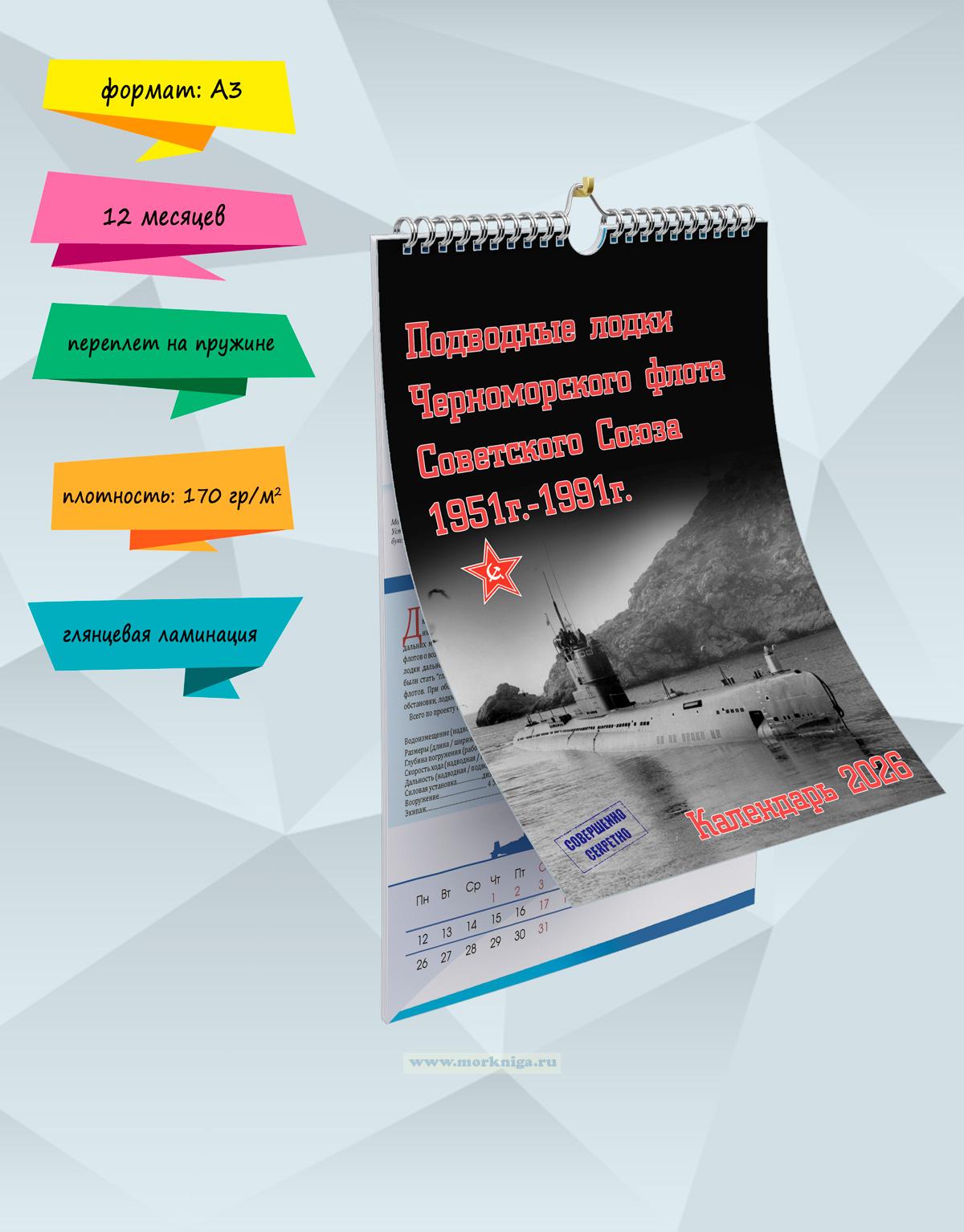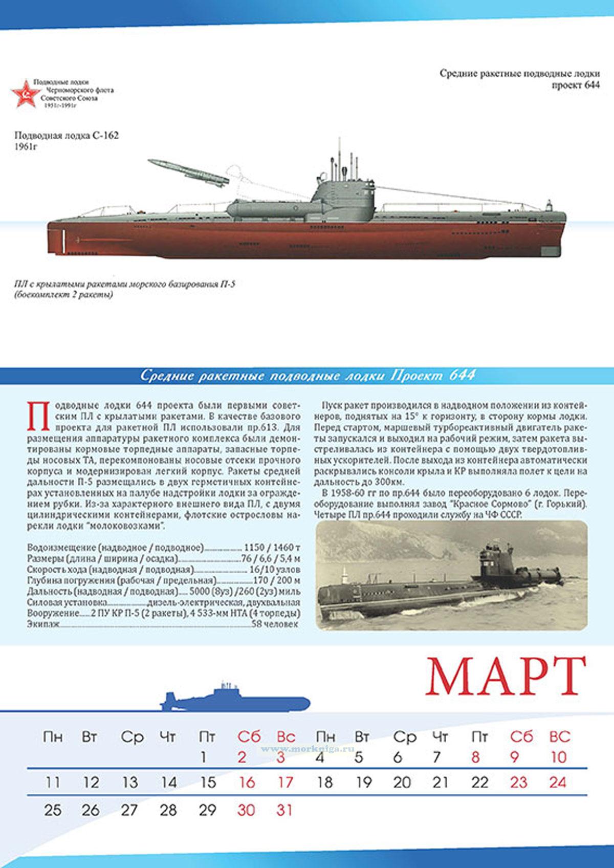 Календарь содержит изображения и краткую информацию о подводных лодках Черноморского флота Советского Союза 1951-1991 гг.: