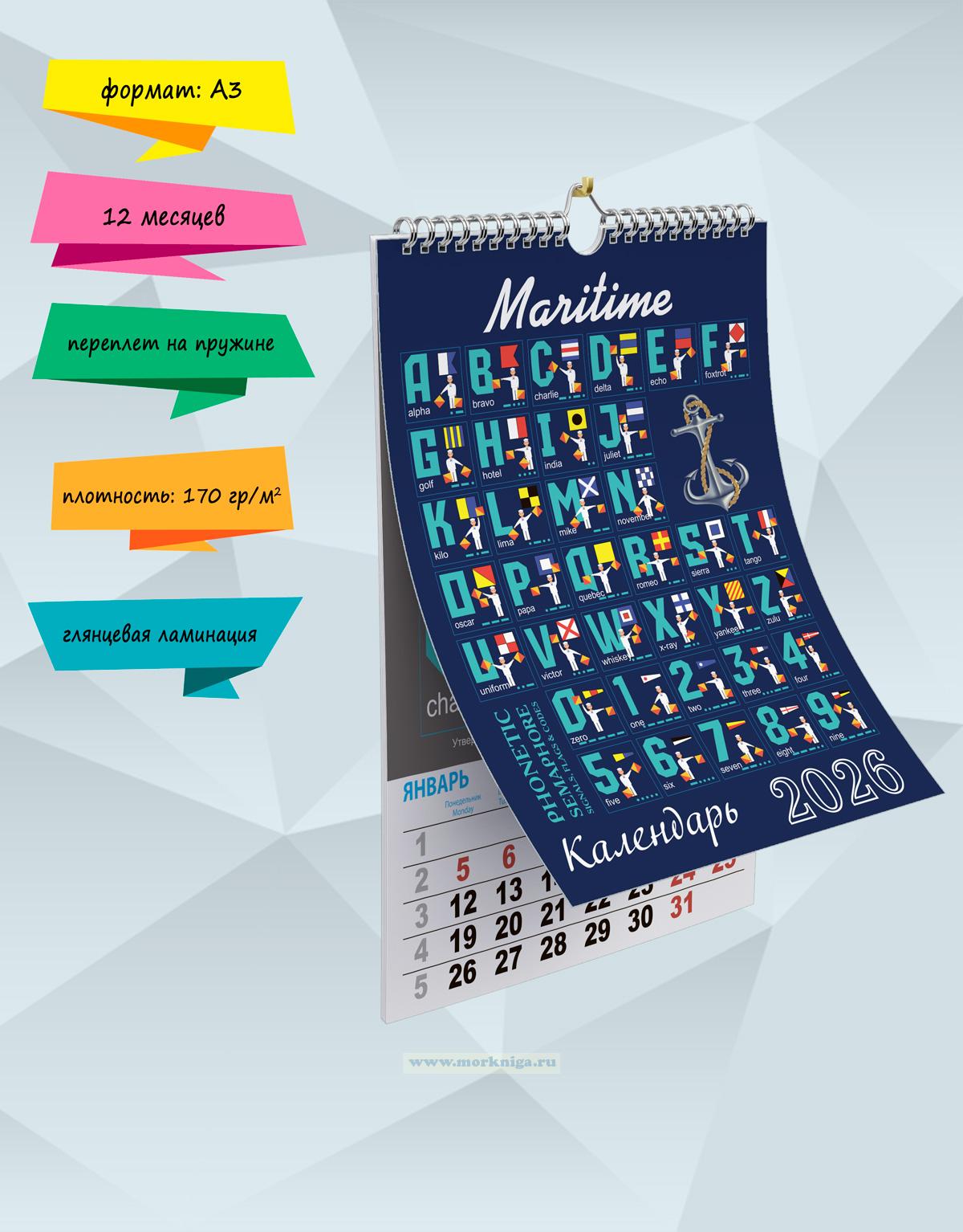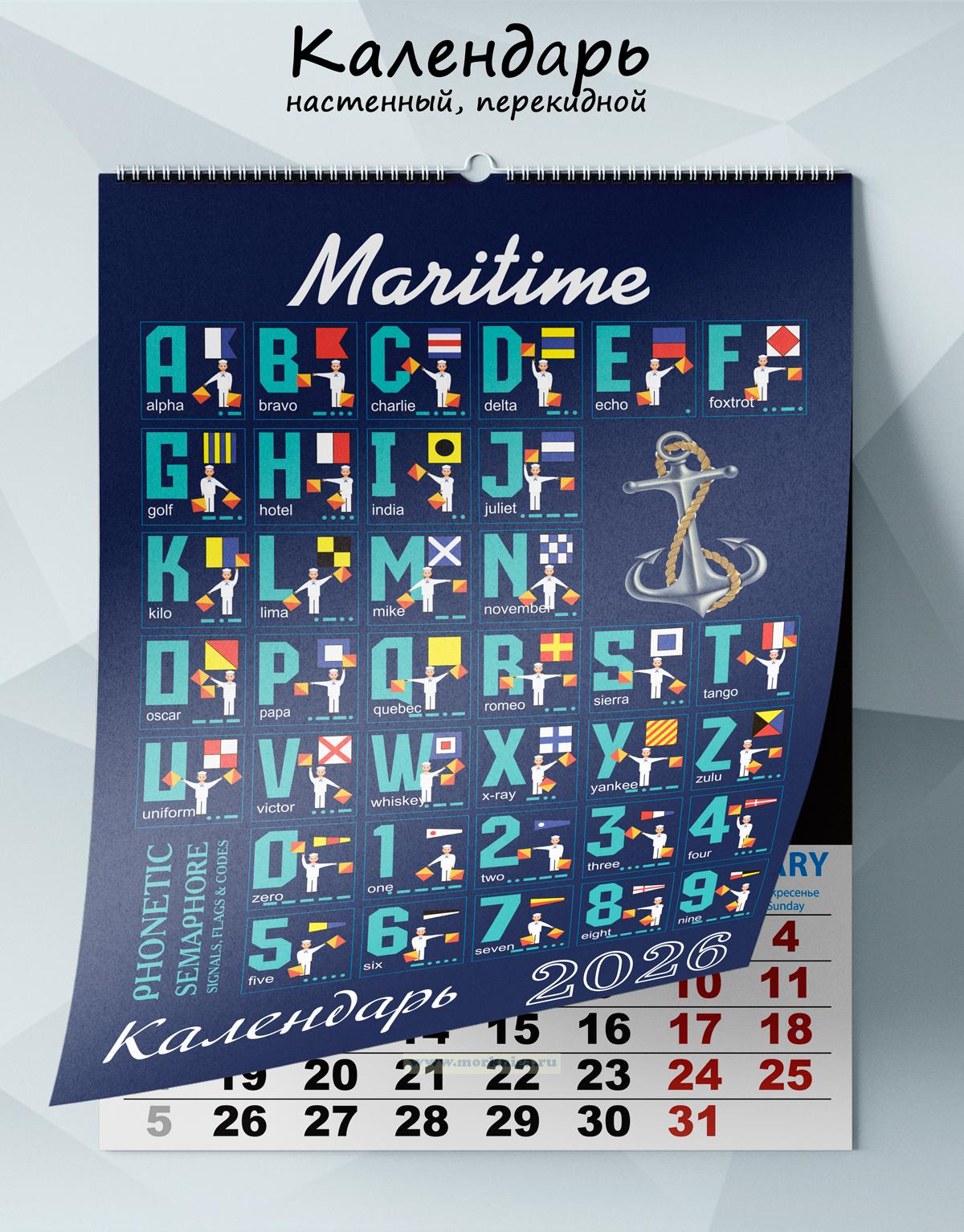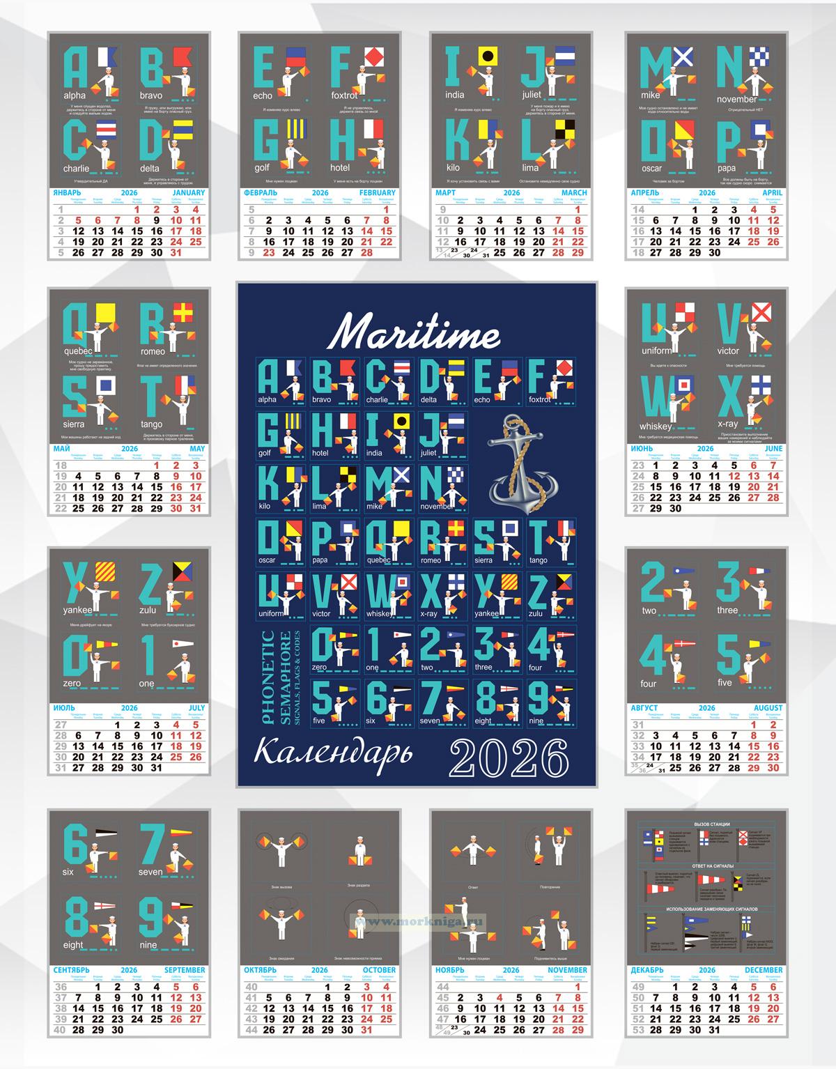 Календарь содержит фонетические семафорные сигналы, флаги и коды с расшифровками.