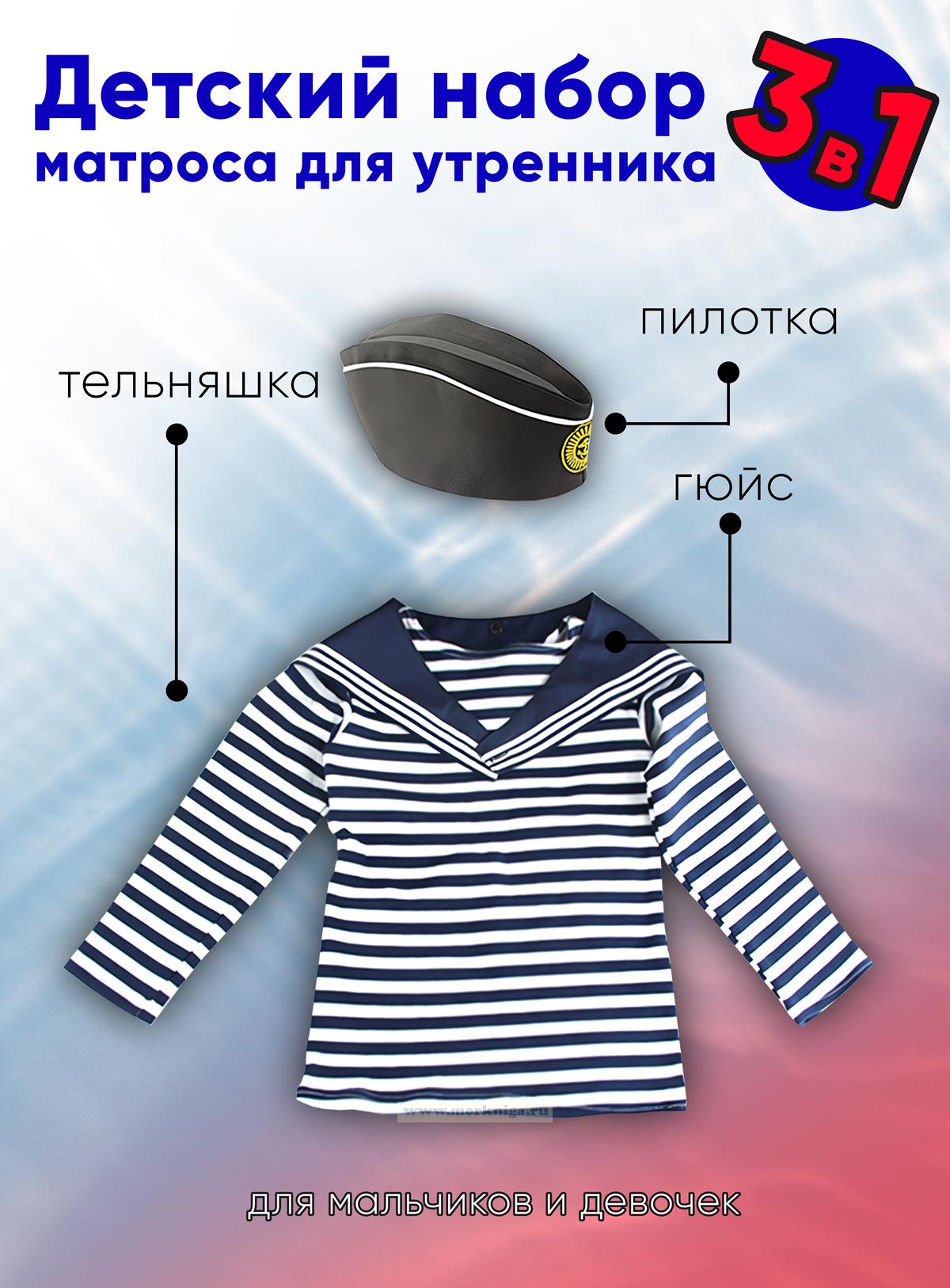 Детский набор матроса для утренника (тельняшка: 32 размер, пилотка: 54 размер (на рост 116-122, до 7 лет) и гюйс белый) (819 руб.)