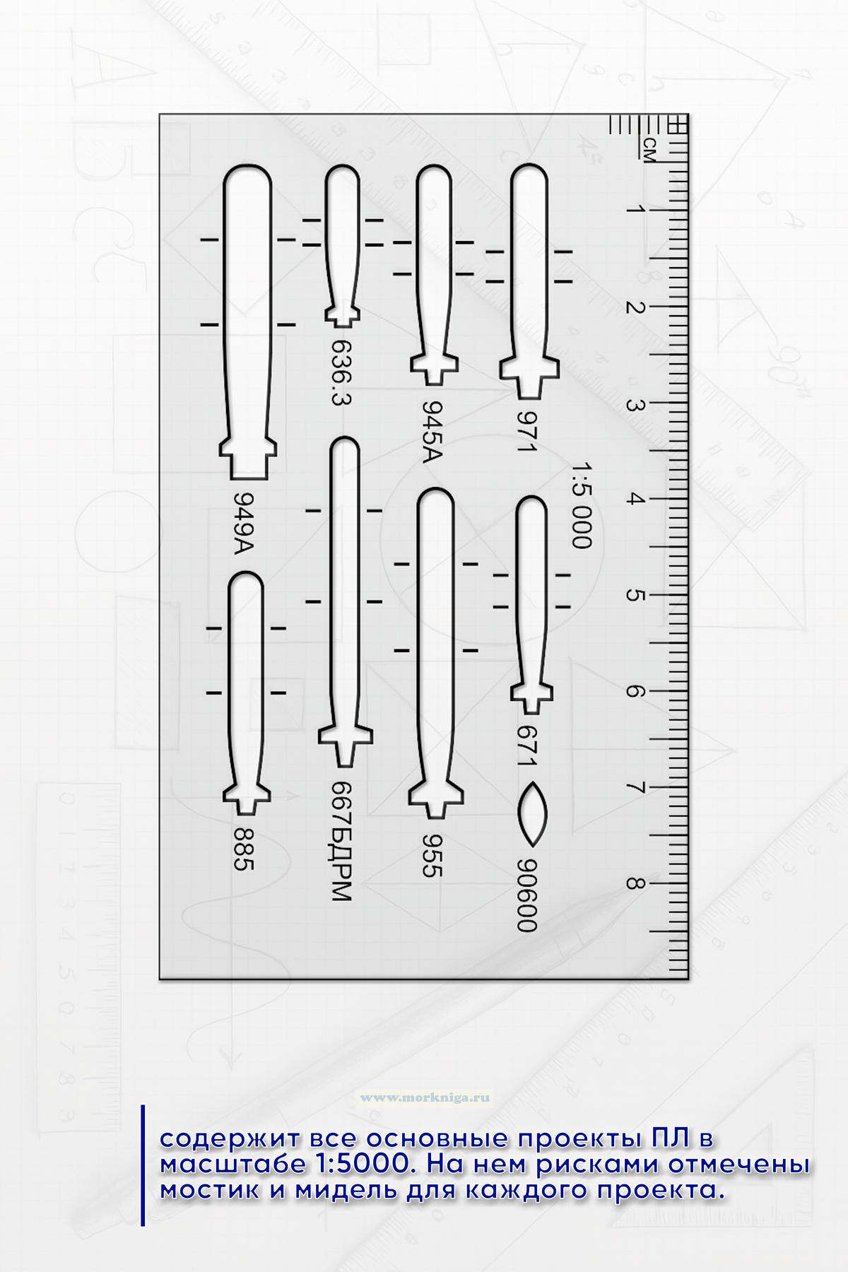 Трафарет содержит все основные проекты ПЛ в масштабе 1:5000. На нем рисками отмечены мостик и мидель для каждого проекта.