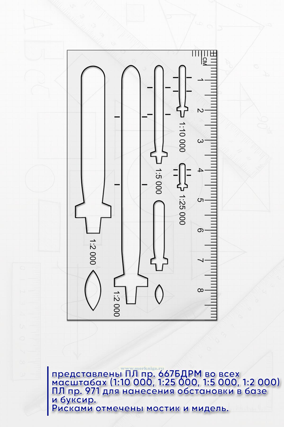 На трафарете представлены ПЛ пр. 667БДРМ во всех масштабах (1:10 000, 1:25 000, 1:5 000, 1:2 000), ПЛ пр. 971 для нанесения обстановки в базе и буксир. Рисками отмечены мостик и мидель.