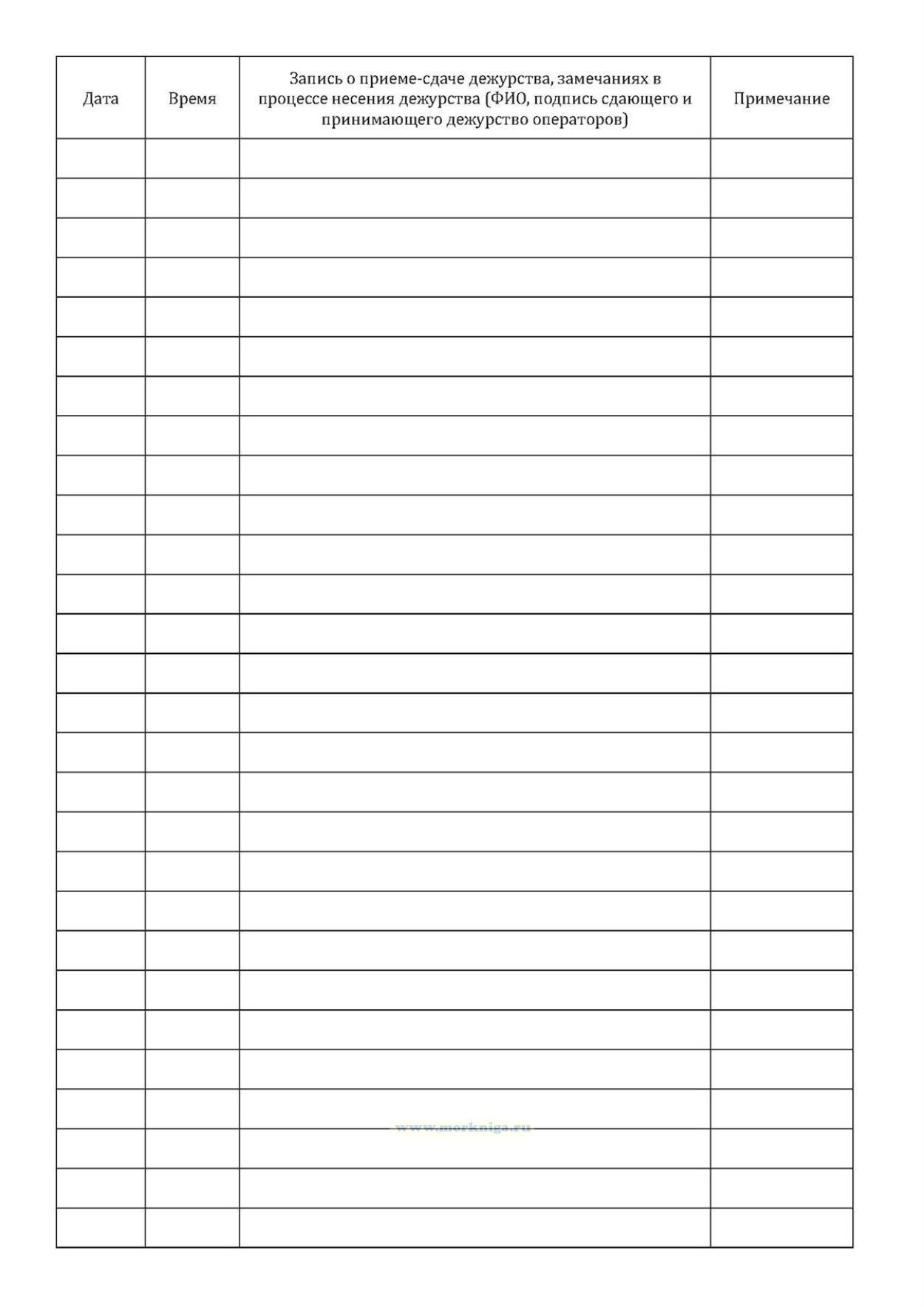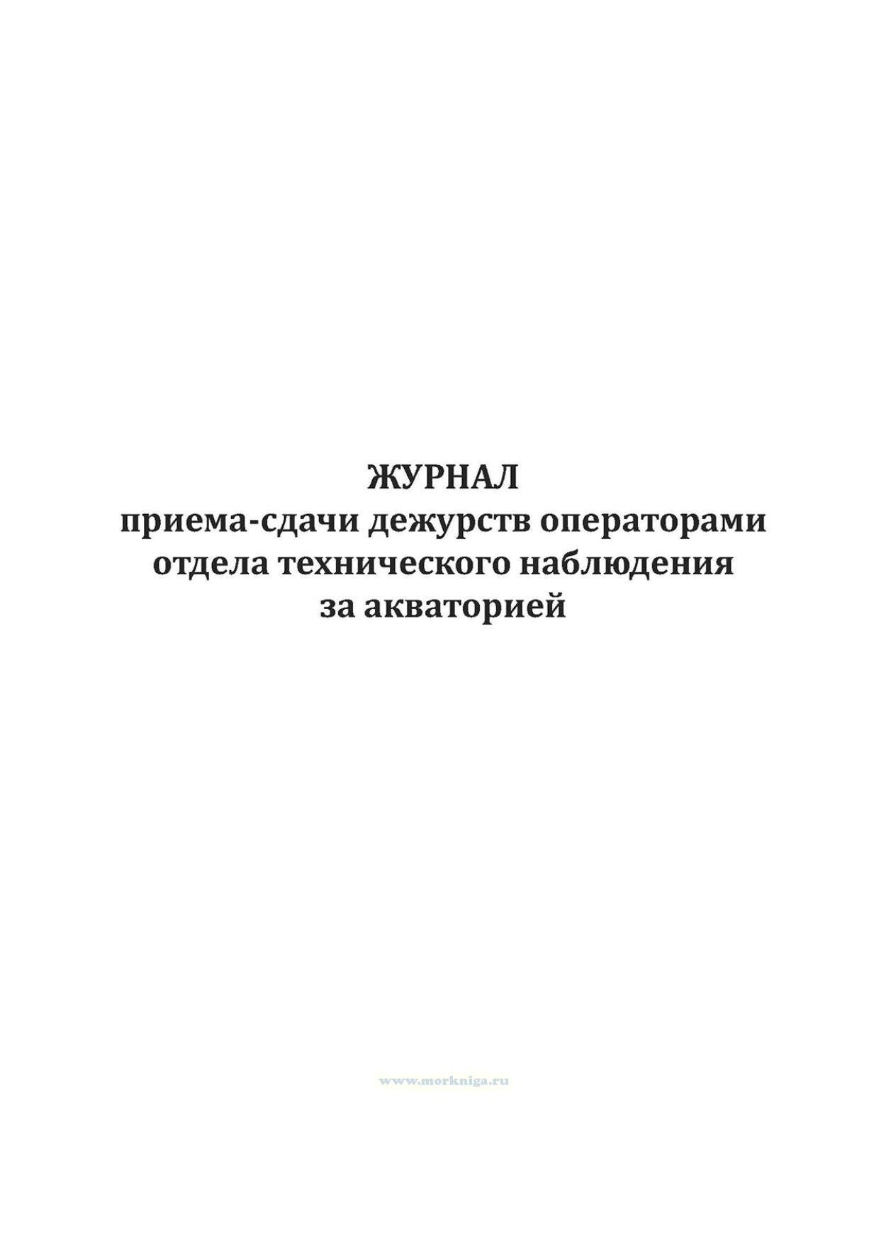 В журнале фиксируют время и дату приема и сдачи дежурства операторами отдела технического наблюдения за акваторией. Журнал является конфиденциальным документом и хранится на рабочем месте дежурного оператора отдела ТНА с соблюдением мер, направленных на предотвращение разглашения информации, содержащейся в нем. Графы Журнала приема-сдачи дежурств операторами отдела технического наблюдения за акваторией: Дата Время Запись о приеме-сдаче дежурства, замечаниях в процессе несения дежурства (ФИО, подпись сдающего и принимающего дежурство операторов) Примечание