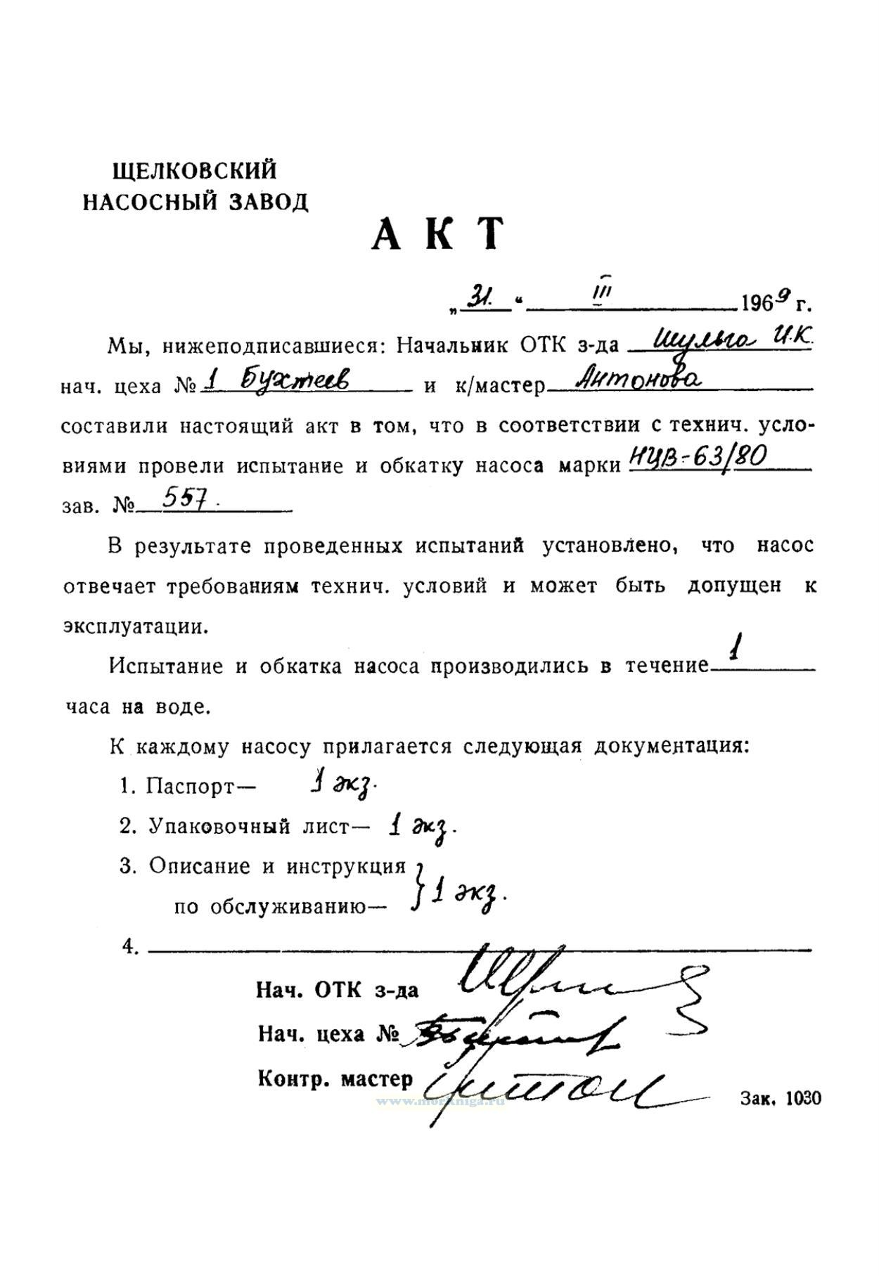 Акт составляется в том, что в соответствии с техническими условиями было проведено испытание и обкатка насоса марки НЦВ 63/80 зав. №557.