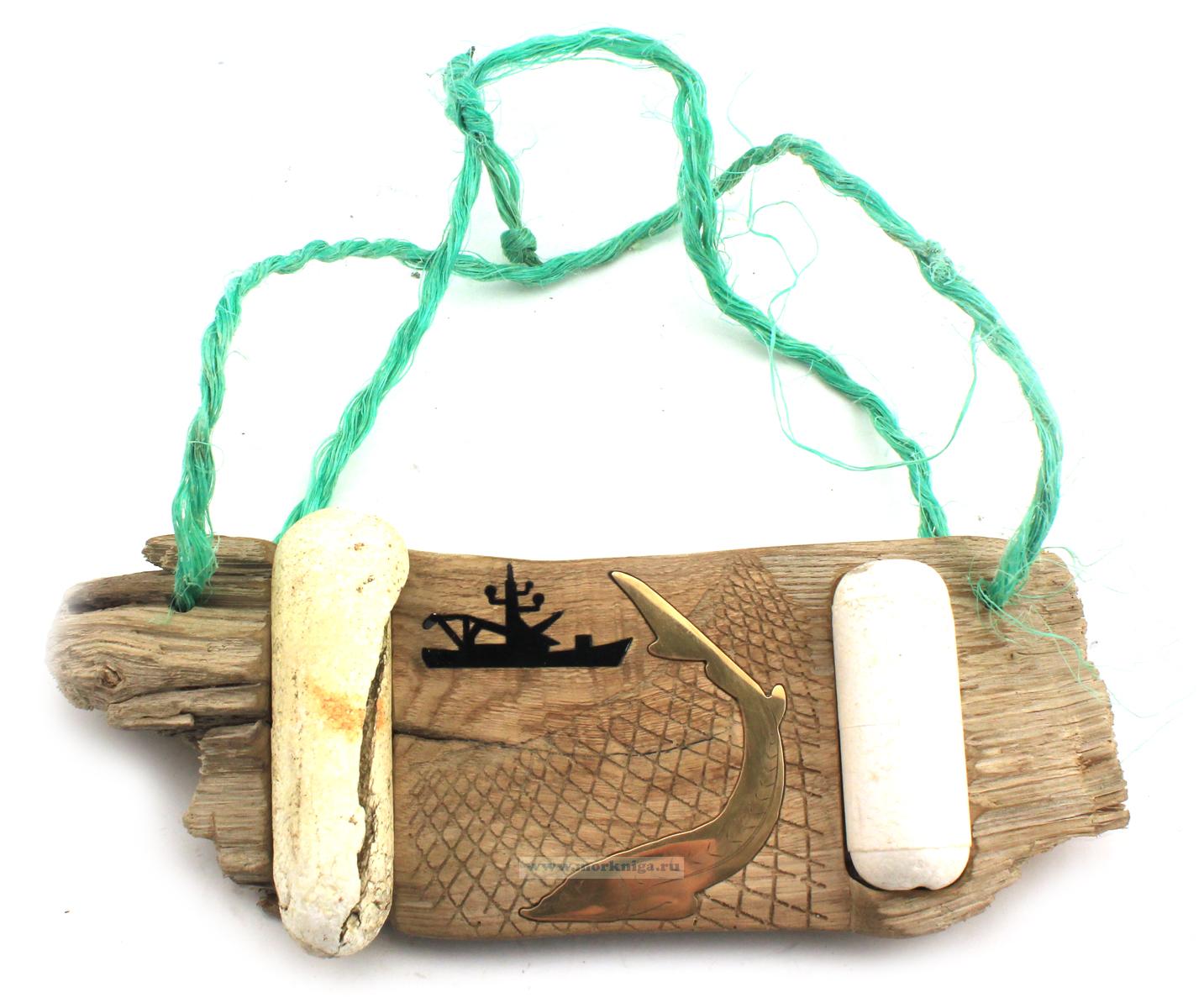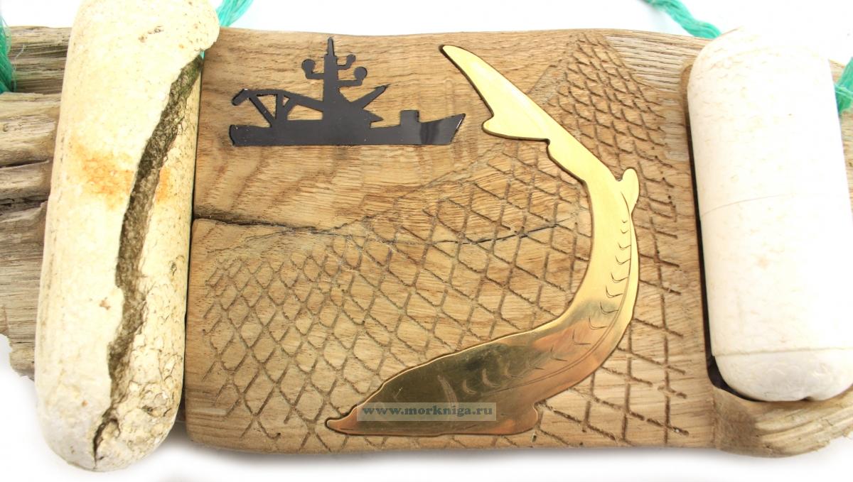 Табличка состоит из латунной вставки с изображением осетра, размещенной на морёной деревянной планке, на которую нанесены с помощью резьбы сеть и методом выжигания корабль. Материалы, использованные в изделии, обработаны только самой природой с минимальным вмешательством человеческой руки. Пригодится для тематического оформления интерьера, а также станет отличным подарком для близких и коллег.