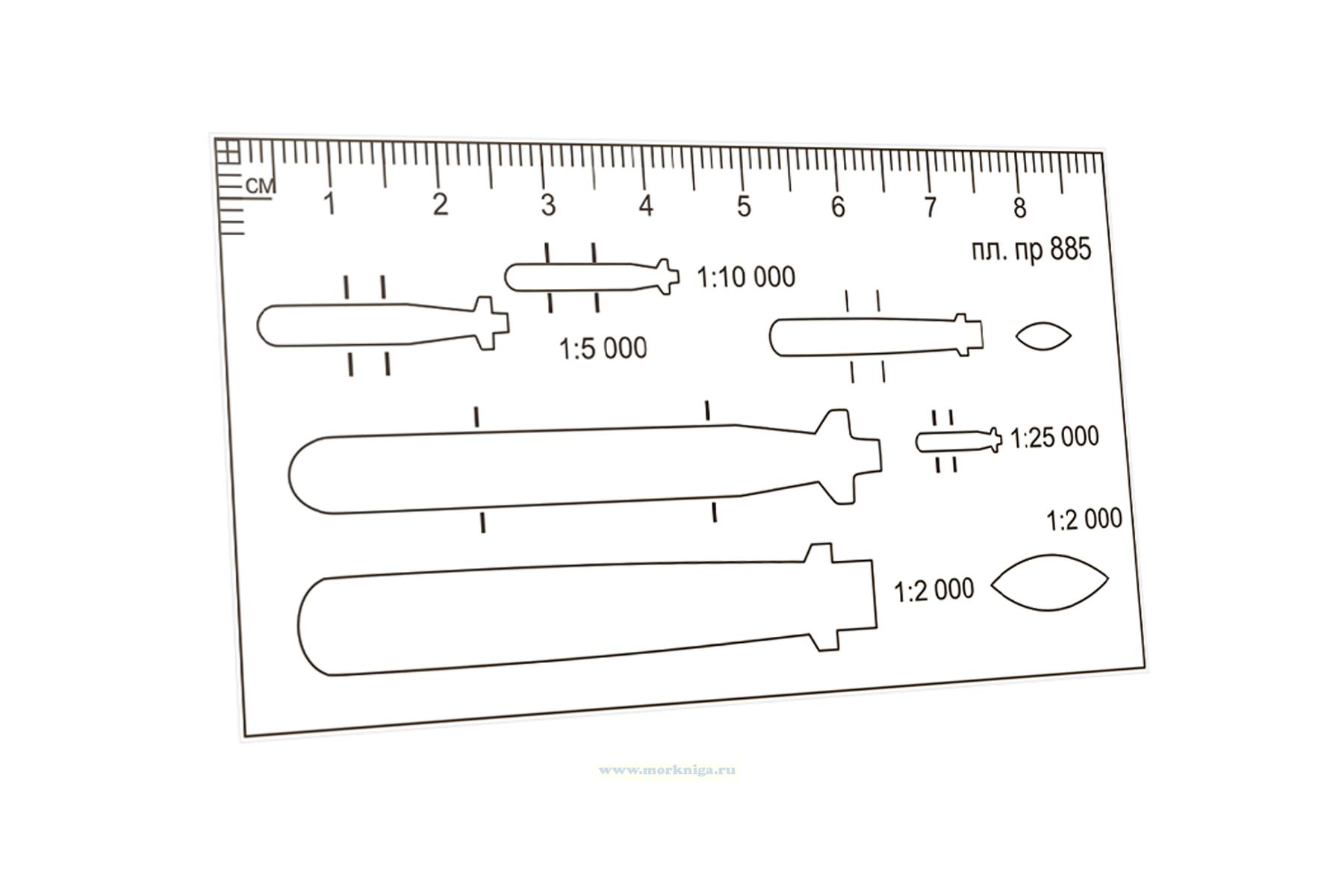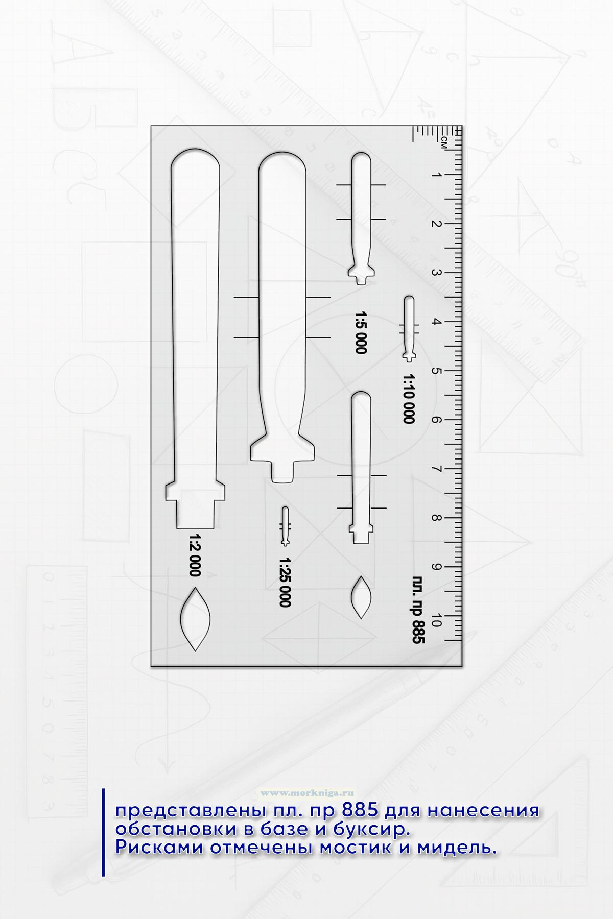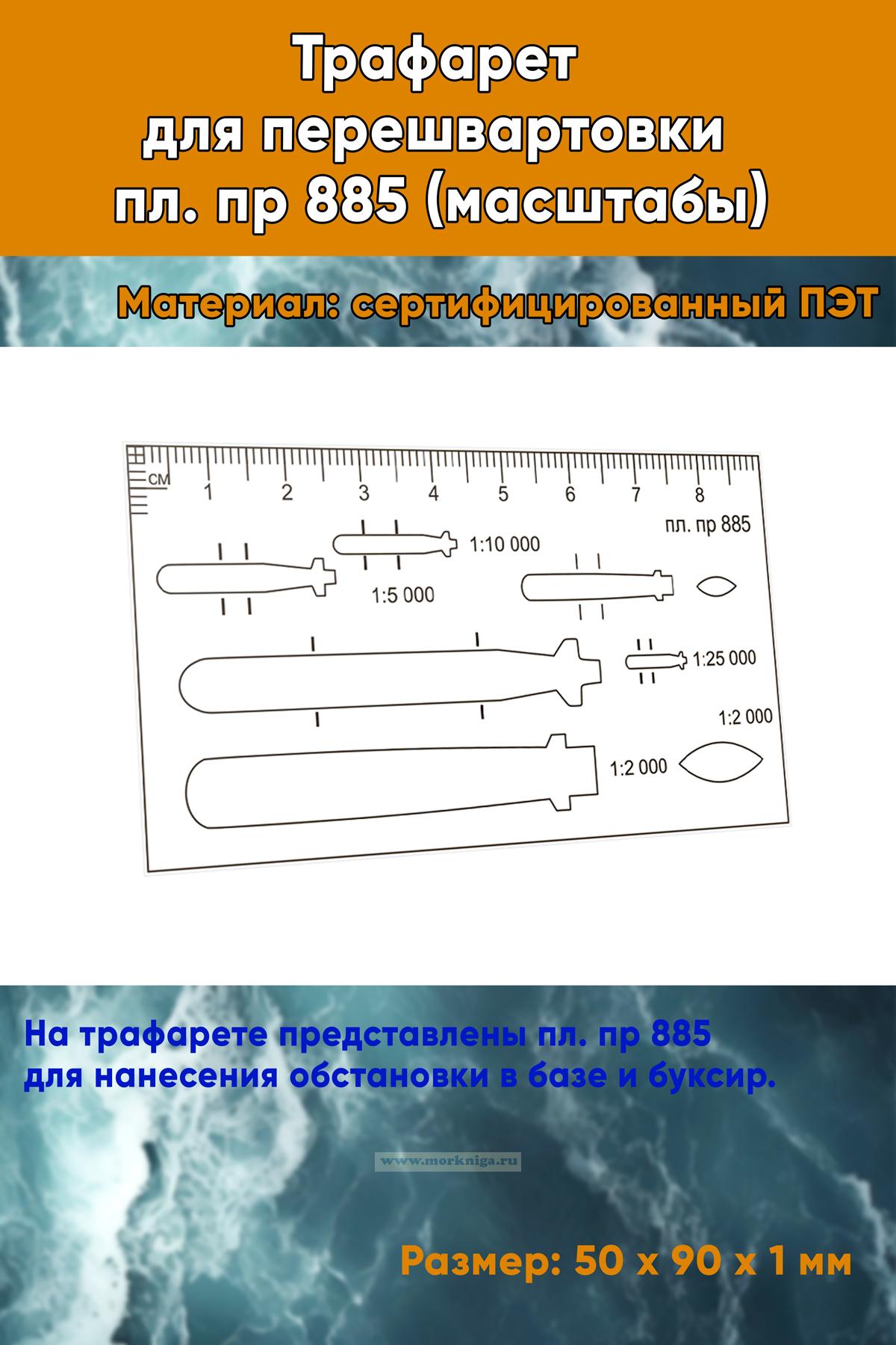 На трафарете представлены пл. пр 885 для нанесения обстановки в базе и буксир. Рисками отмечены мостик и мидель.