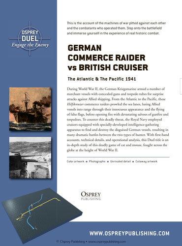 During World War II, the Kriegsmarine armed a number of merchant vessels with concealed guns and torpedo tubes for surprise attacks against Allied shipping. To counter this deadly threat, the Royal Navy employed cruisers and their intelligence-gathering apparatus to find and destroy the disguised German commerce raiders. This Duel title covers the deadly game of cat and mouse, fought by these surface vessels during World War II.
