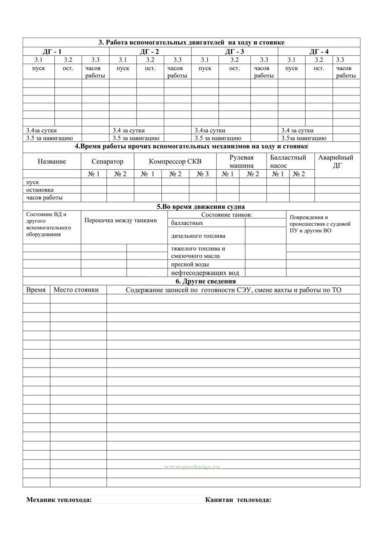 Машинный журнал для судна с механическим двигателем, эксплуатируемого членами экипажа судна без совмещения должностей содержит разделы: