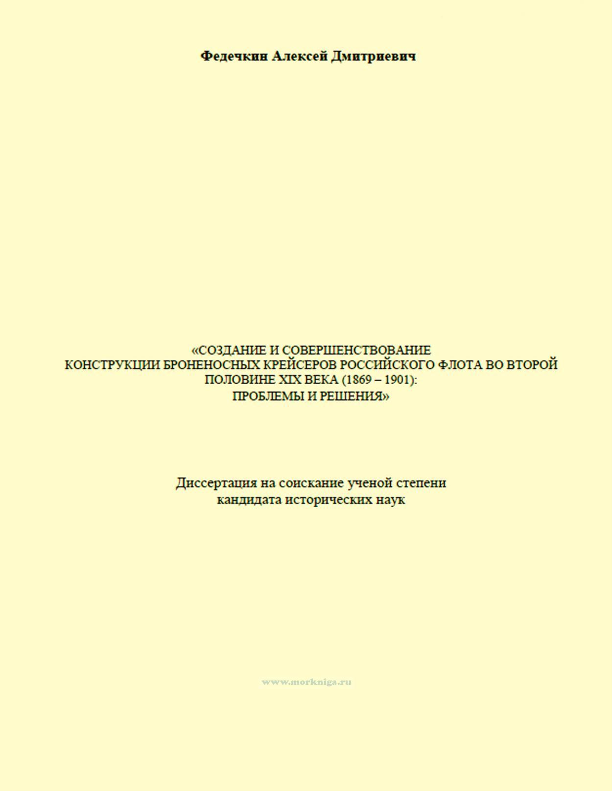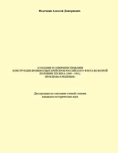 Период создания боевых единиц, оснащённых броневой защитой по ватерлинии и специально предназначенных для операций на торговых путях неприятеля, занимает особое место в истории отечественного флота. Явившись первоначально вынужденной мерой противодействия вероятному противнику, эти корабли постепенно стали одной из главных составляющих военно-морских сил Российской империи и важным инструментом внешней политики государства. Стремление совместить в ограниченных габаритах большую автономность, быстроходность, защищённость и огневую мощь привело к разработке целого ряда уникальных проектов, высокие тактико-технические качества которых отмечали в том числе и зарубежные специалисты. При этом вступление в строй русских броненосных рейдеров неоднократно вынуждало ведущие мировые державы существенно корректировать свои судостроительные программы, что также служило признанием успешного труда отечественных кораблестроителей. Данное исследование посвящено вопросам проектирования и постройки в России океанских броненосных крейсеров и затрагивает внешнеполитические, научно-технические и экономические аспекты их создания в 1869 – 1901 гг. Освещаемый исторический этап совпал с усилением борьбы крупных мировых держав за колонии и рынки сбыта и поисками надёжных средств защиты отдалённых территорий и торговых коммуникаций. Ими стали корабли крейсерского назначения принципиально новой конструкции, защищённые поясной бронёй по ватерлинии. Эти боевые единицы объединяли в себе достаточно разноречивые качества, став в относительно короткие сроки одной из главных составляющих военно-морских сил многих государств последней четверти XIX в. В диссертации рассматривается зарождение и дальнейшее совершенствование конструктивного типа отечественных броненосных крейсеров в тесной связи с внешнеполитическим и экономическим положением Российской империи во второй половине XIX в.