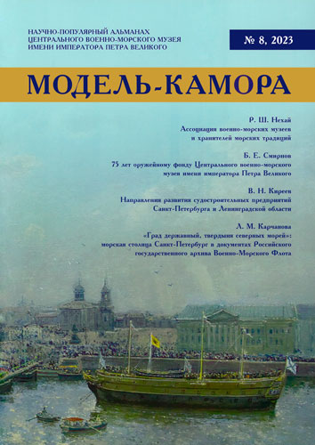 В 2023 году главным событием в Санкт-Петербурге стало празднование 320-летия со дня основания морской столицы России. Также отмечалось 100-летие создания Экспедиции подводных работ особого назначения - легендарного ЭПРОНа. Центральный военно-морской музей имени императора Петра Великого к этому значимому событию в жизни города провел в апреле научно-практическую конференцию “Морская столица России. К 320-летию Санкт-Петербурга”. В канун конференции в выставочном комплексе ЦВММ была открыта крупномасштабная выставка “Санкт-Петербург - морская столица России”, к которой выпущен яркий красочный каталог. Реализован и другой крупный выставочный проект “От морской слободы к морской столице”, сопровождавшийся выходом в свет одноименного издания. Также подарком к юбилею Санкт-Петербурга можно считать выпуск художественного альбома “Мастера русского и западноевропейского искусства в собрании Центрального военно-морского музея имени императора Петра Великого”. Важным датам в истории Санкт-Петербурга и ЭПРОНа посвящен ряд статей предлагаемого Вашему вниманию восьмого выпуска научно-популярного альманаха “Модель-камора”. В нем значительное внимание уделено различным аспектам морской летописи России и СССР, видным флотоводцам, истории фондов ЦВММ. Редакция альманаха “Модель-камора”, как и прежде, заинтересована в привлечении новых авторов, которые внесут свою лепту в освещение истории отечественного Военно-Морского Флота и дело сохранения и приумножения морского историко-культурного наследия России.