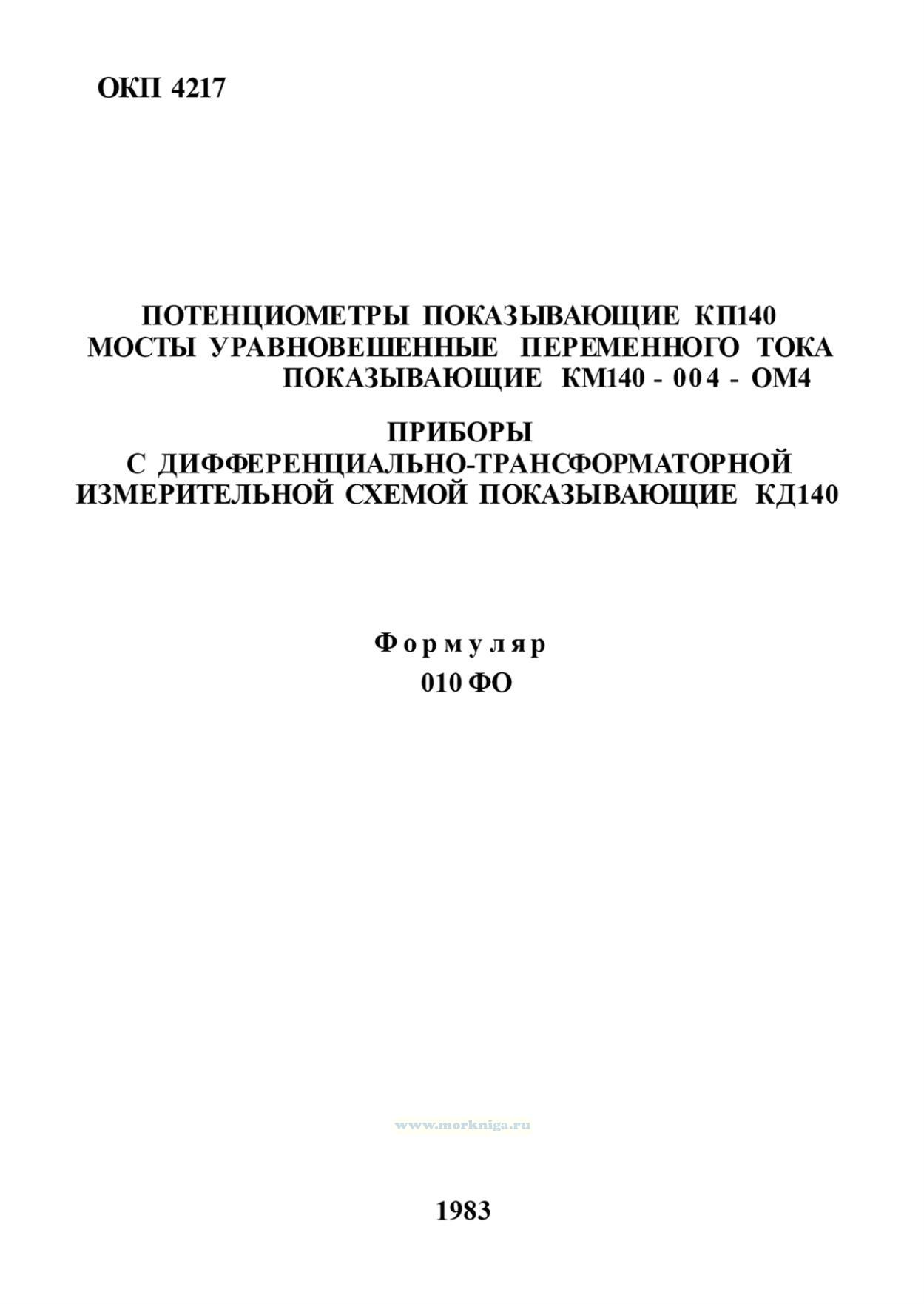 Формуляр 010 ФО. Потенциометры показывающие КП140 мосты уравновешенные переменного тока показывающие КМ140.Содержит технические данные и основные характеристики.