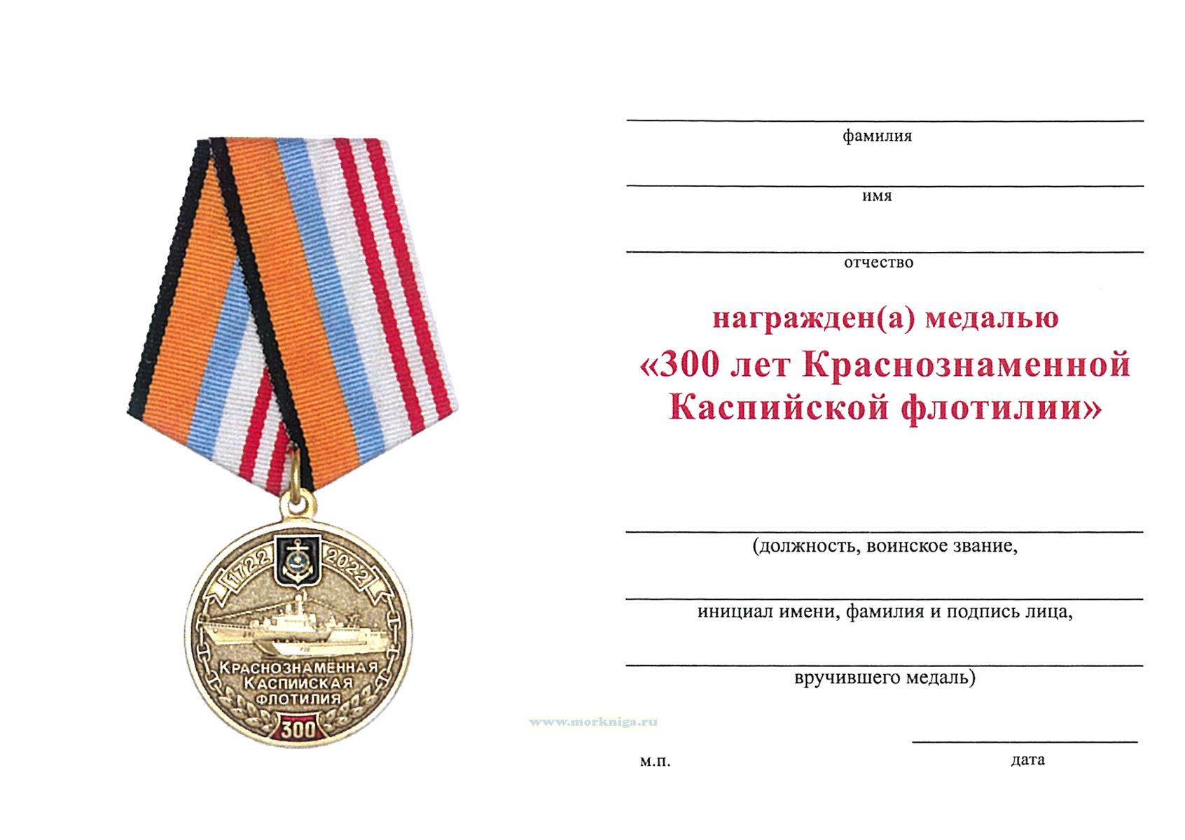 Ниже кораблей расположены три строки рельефной надписи: Краснознамённая Каспийская флотилия. По окружности медаль украшена вверху лентой, в середине которой находится эмалевая эмблема Каспийской флотилии, по краям даты 1722 и 2022. В нижней части окружности эмалевая вставка с числом "300" на красном фоне. Слева и справа расположены веточки, соединенные якорной цепью с лентами вверху.