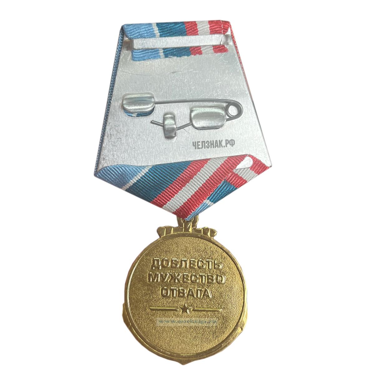 Реверс оформлен лаконично. В центре поля надпись в три строки "доблесть", "мужество", "отвага". Ниже полоса, разделенная в центре пятиконечной звездой.