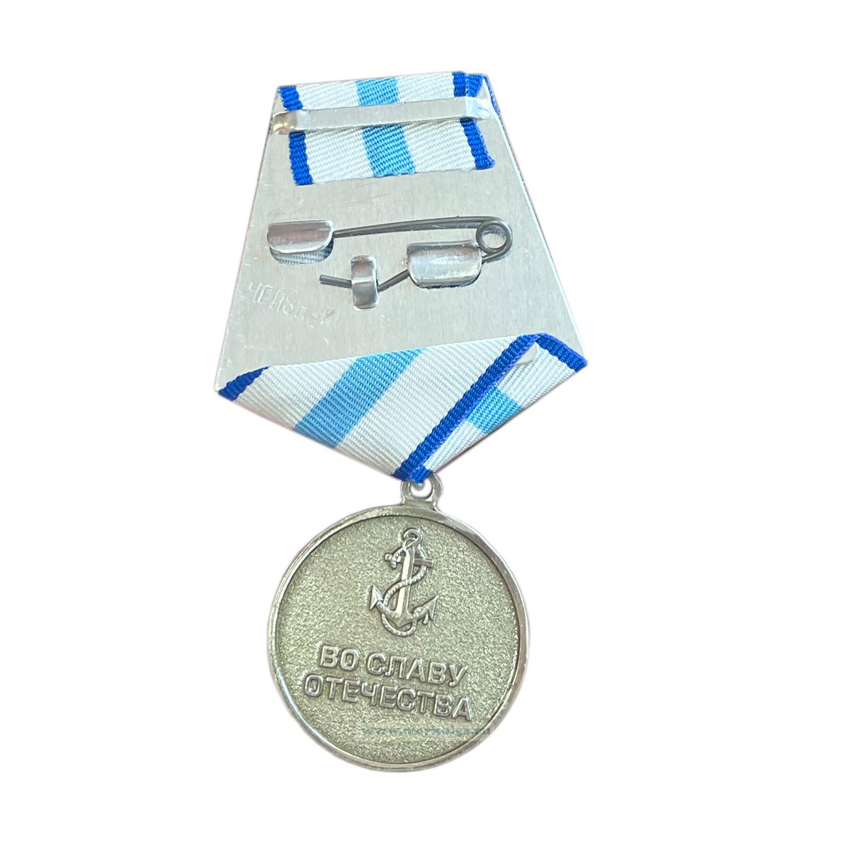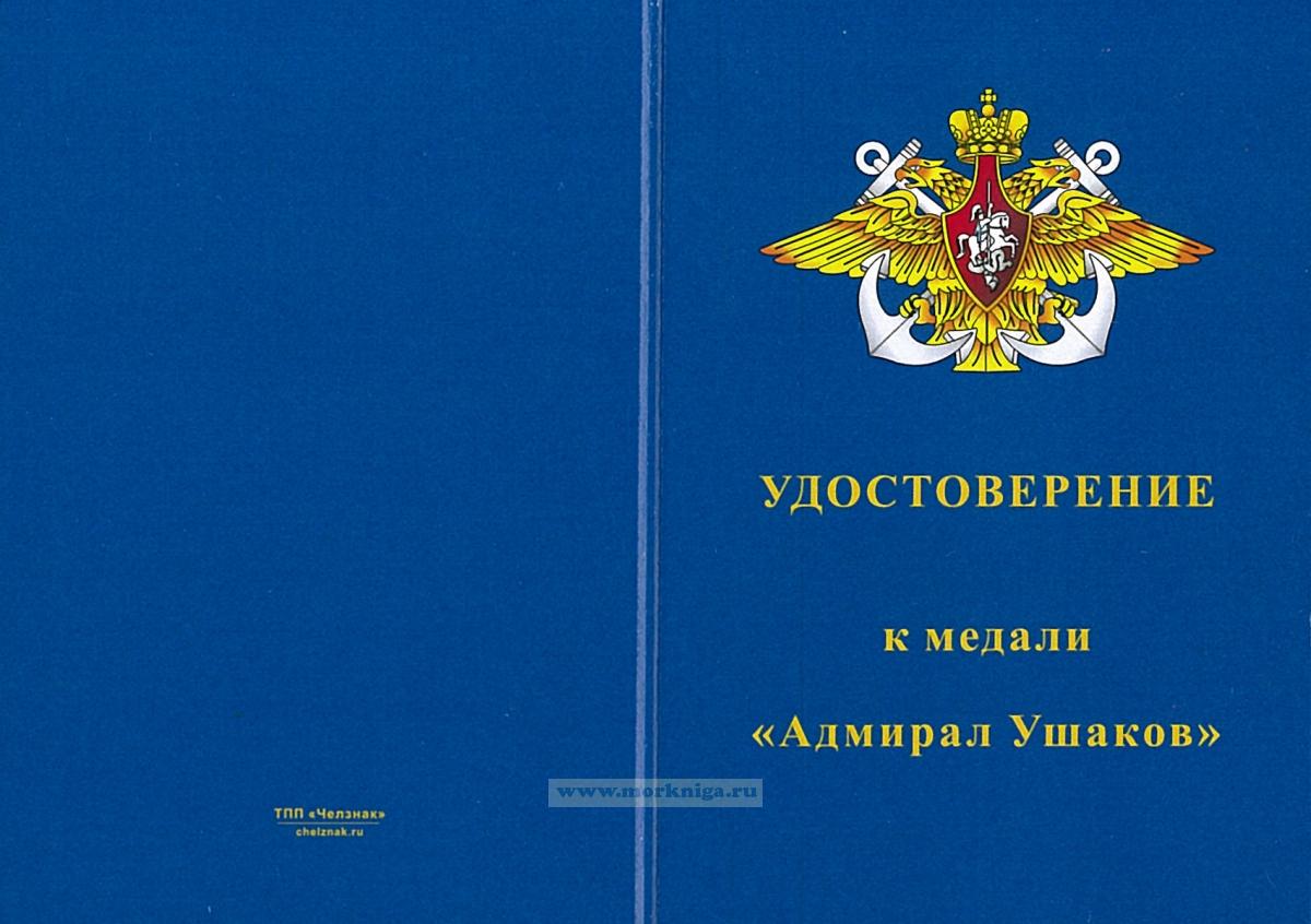 Медаль имеет круглую форму. На лицевой стороне изображен синий крест с лучами одинаковой длины, которые расширяются от центра к краям. В центре креста лежит круглый медальон. На нем выделяется выпуклый портрет полководца, сверху вокруг которого написано «АДМИРАЛ УШАКОВ». На обороте награды надпись «ВО СЛАВУ ОТЕЧЕСТВА».