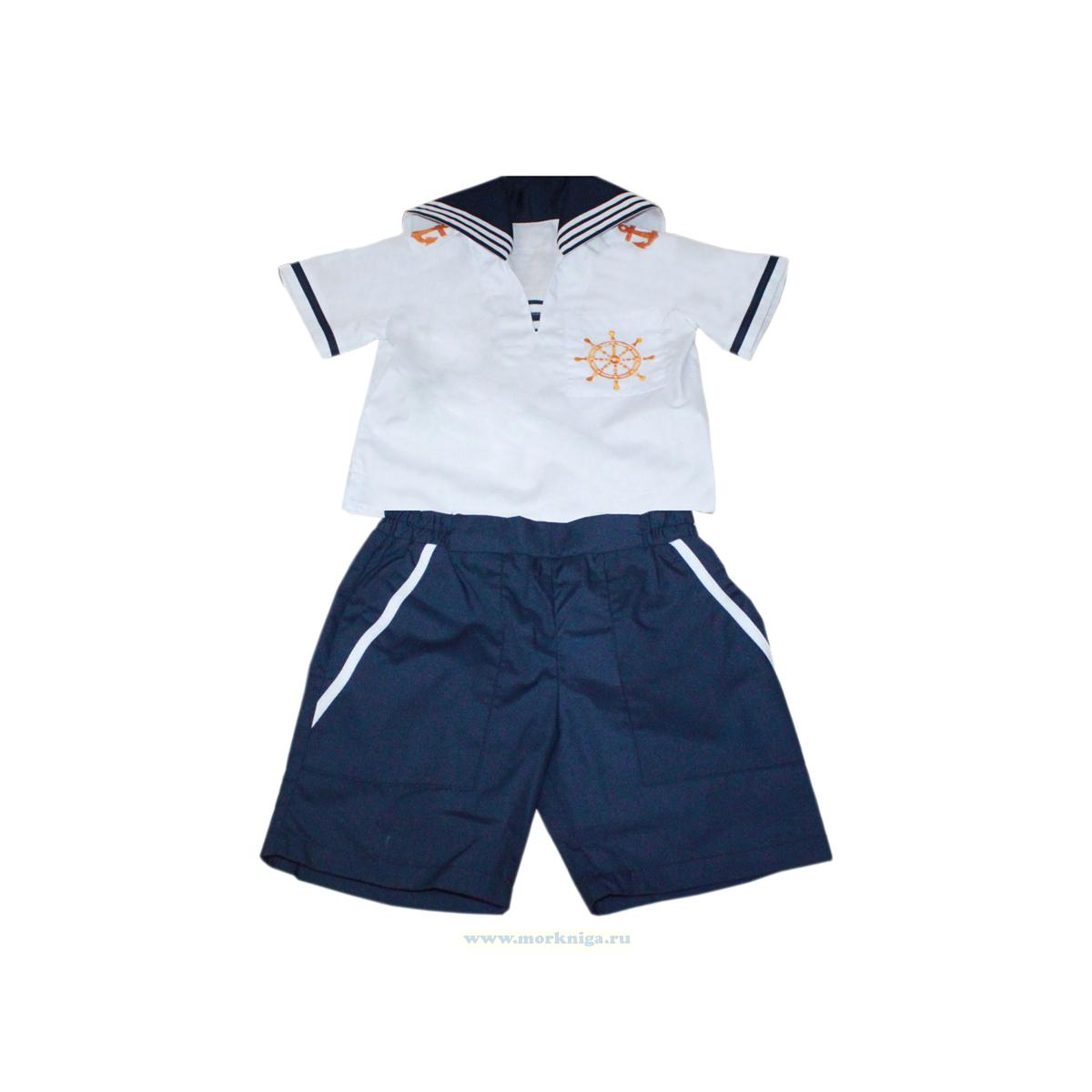 Костюм состоит из двух частей: рубашка с пришитым гюйсом и вставкой-обманкой «тельняшка»; шорты.