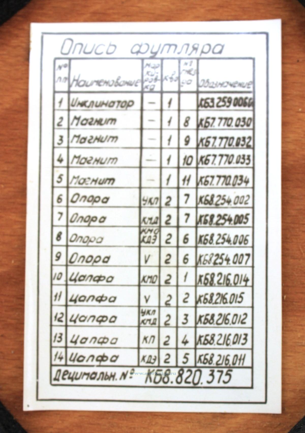 Судовым инклинатором называется прибор, позволяющий определять величину наклонения магнитного поля судна. Этим прибором можно также определить наклонение магнитного поля Земли. Предназначен судовой инклинатор для уничтожения креновой девиации магнитного компаса.