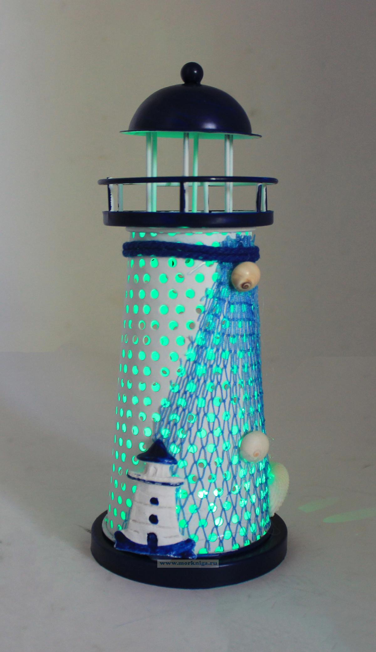 Маяк изготовлен из металла, окрашен в классические морские цвета - белый и синий. Этот аксессуар добавит нотку романтики в ваш интерьер. Его небольшие размеры позволяют разместить его на полке, столике или даже на рабочем столе, чтобы вдохновлять вас на новые приключения. Сувенир имеет два режима подсветки. Маяк упакован в картонную коробку с дизайном, и может послужить отличным подарком для любителей морской тематики.
