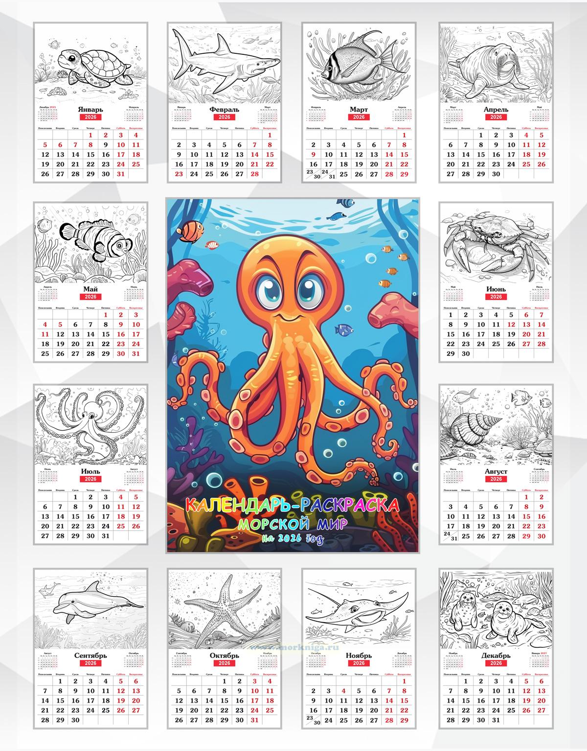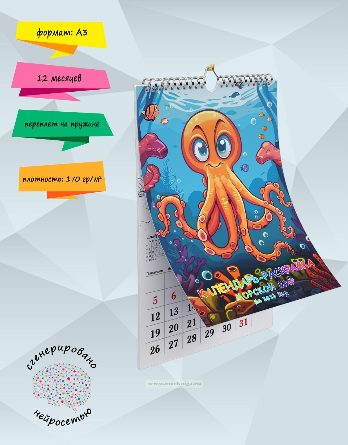 Календарь-раскраска, содержит мультяшные изображения морских жителей, сгенерированные с помощью нейросети. Страницы можно раскрасить: карандашами, фломастерами, цветными ручками, красками. Календарь будет отличным подарком для ваших родных, друзей, знакомых, коллег или даже для себя.
