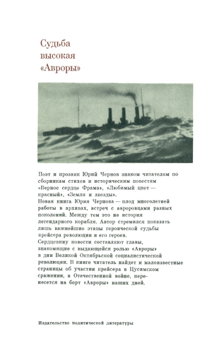 Поэт и прозаик Юрий Чернов знаком читателям по сборникам стихов и историческим повестям “Верное сердце Фрама”, “Любимый цвет – красный”, “Земля и звезды”. Книга “Судьба высокая “Авроры” – плод многолетней работы в архивах, встреч с авроровцами разных поколений. Между тем это не история легендарного корабля. Автор стремился показать лишь важнейшие этапы героической судьбы крейсера и его героев. Сердцевину повести составляют главы, знакомящие с выдающейся ролью «Авроры» в дни Октябрьской революции. В книге читатель найдет и малоизвестные страницы об участии крейсера в Цусимском сражении и в Великой Отечественной войне.