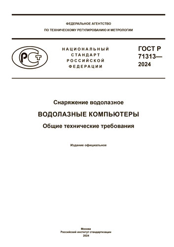 ГОСТ Р 71313- 2024 Водолазные компьютеры. Общие технические требования утвержден и введен в действие Приказом Федерального агентства по техническому регулированию и метрологии от 28 марта 2024 г. № 370-ст.