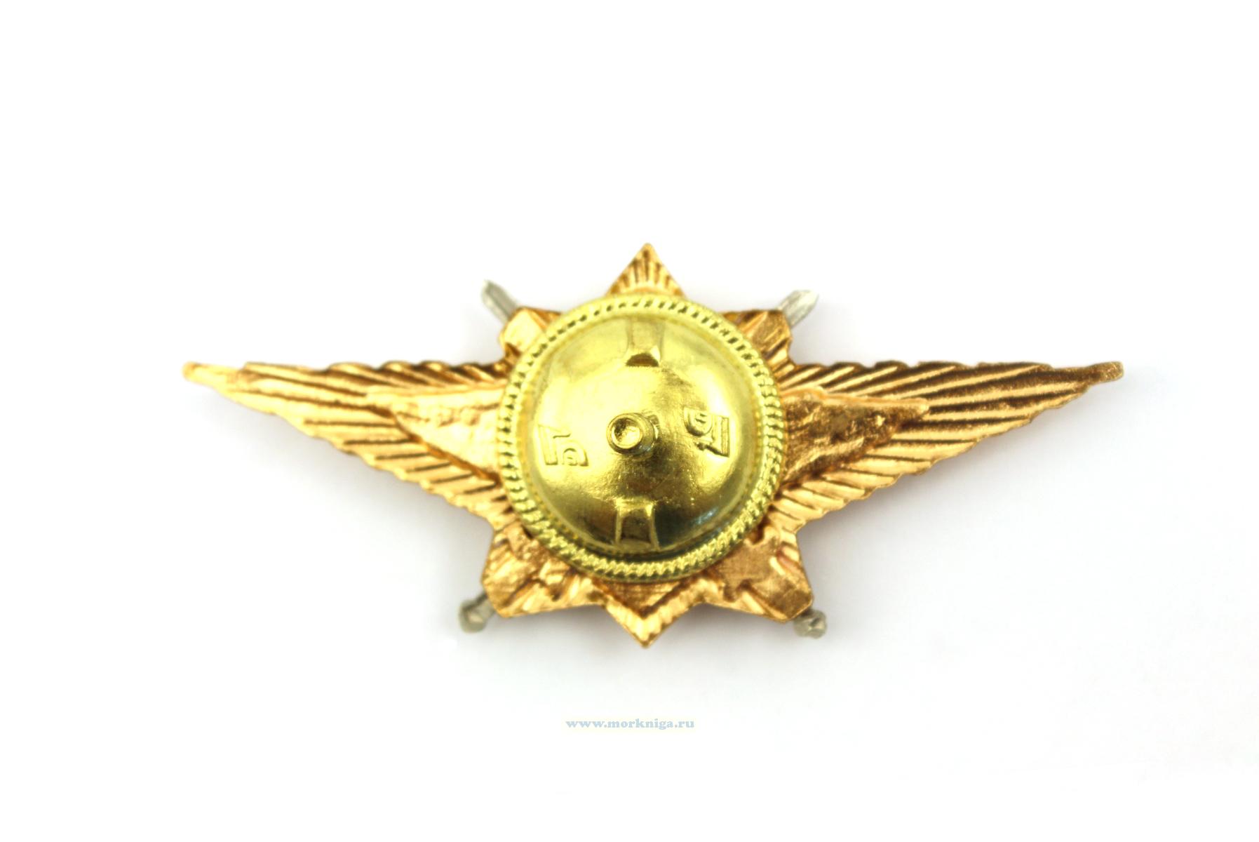 В центре знака расположен щит с 10 скрепами серебристого цвета, вписанный в якорь. В центре синего щита буква «М» белого цвета, обозначающая классную квалификацию. На заднем плане два перекрещенных меча острием вверх и двойные распростертые крылья.