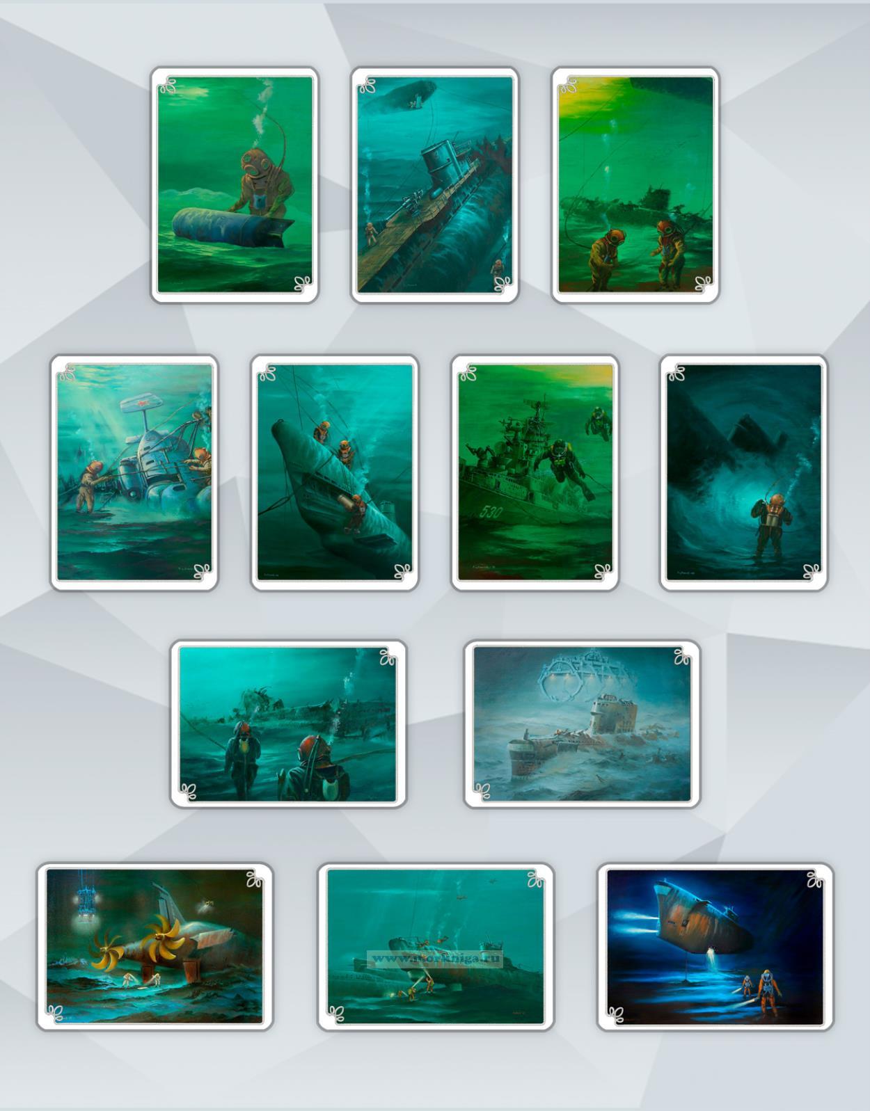 Набор открыток содержит изображения 12 работ художника-мариниста Андрея Лубянова: - Водолазы Черноморского флота в трехболтовом снаряжении обнаруживают затонувшую Щ-204; - Водолаз в диамагнитном снаряжении разоружает немецкую магнитную мину на внешнем рейде Севастополя; - Французские водолазы обследуют затонувшую немецкую подводную лодку; - Идут работы на Щ-204; - Водолаз Черноморского флота в снаряжении ГКС-3М обнаруживает уткнувшуюся в грунт подводную лодку М-351 у мыса Фиолент; - Трое суток спасательных работ на М-352. И удача! Лодка спасена вместе с экипажем; - Акванавты над погибшим БПК Отважный; - Водолазы подняли немало упавших в море летательных аппаратов; - Водолазы в СВГ-300 выходят из подводной лодки-лаборатории проекта 555; - Помощь в выходе членов экипажа затонувшей С-178 Тихоокеанского флота оказывали водолазы спасательной подводной лодки типа Ленок; - Российские водолазы осматривают погибший Курск; - Безводолазный способ подъема подводной лодки К-129 американцами. Операция Дженифер.