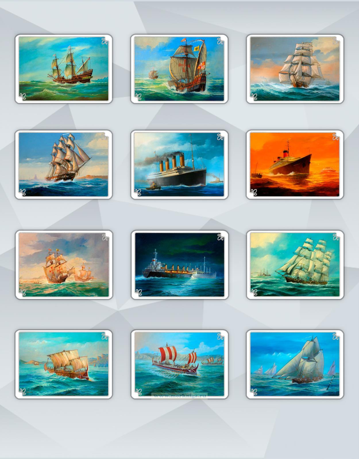 Набор открыток содержит изображения 12 работ художника-мариниста Андрея Лубянова: - "Галион" знаменитого корсара Френсиса Дрейка; - "Санта-Мария" Христофора Колумба; - Гонки чайных клиперов; - Корвет «Оливуца» построенный в Севастополе избороздил много морей и океанов; - Печально известный "Титаник" выходит в свое первый и последний рейс; - Обладатель Голубой ленты Атлантики французский лайнер "Нормандия"; - Пароходы вытеснили с морских торговых путей стремительные и грациозные парусники; - Навалочное судно "Петр Васев" таранит лайнер "Адмирал Нахимов"; - Флотилия Магеллана; - Первыми мореплавателями на черно море были греки; - Греков на черном море сменили генуэзцы. "Бирема" выходит из Балаклавы; - Яхта "Ориадна" адмирала Лазарева, совершила два перехода вокруг Европы.
