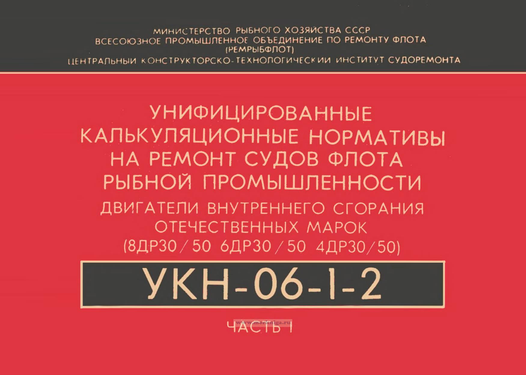 УКН-06-1-2 Унифицированные калькуляционные нормативы на ремонт судов флота рыбной промышленности. Двигатели внутреннего сгорания отечественных марок (8ДР30/50, 6ДР30/50, 4ДР30/50). Часть I утв. Министерством рыбного хозяйства СССР 31.10.1978 г.