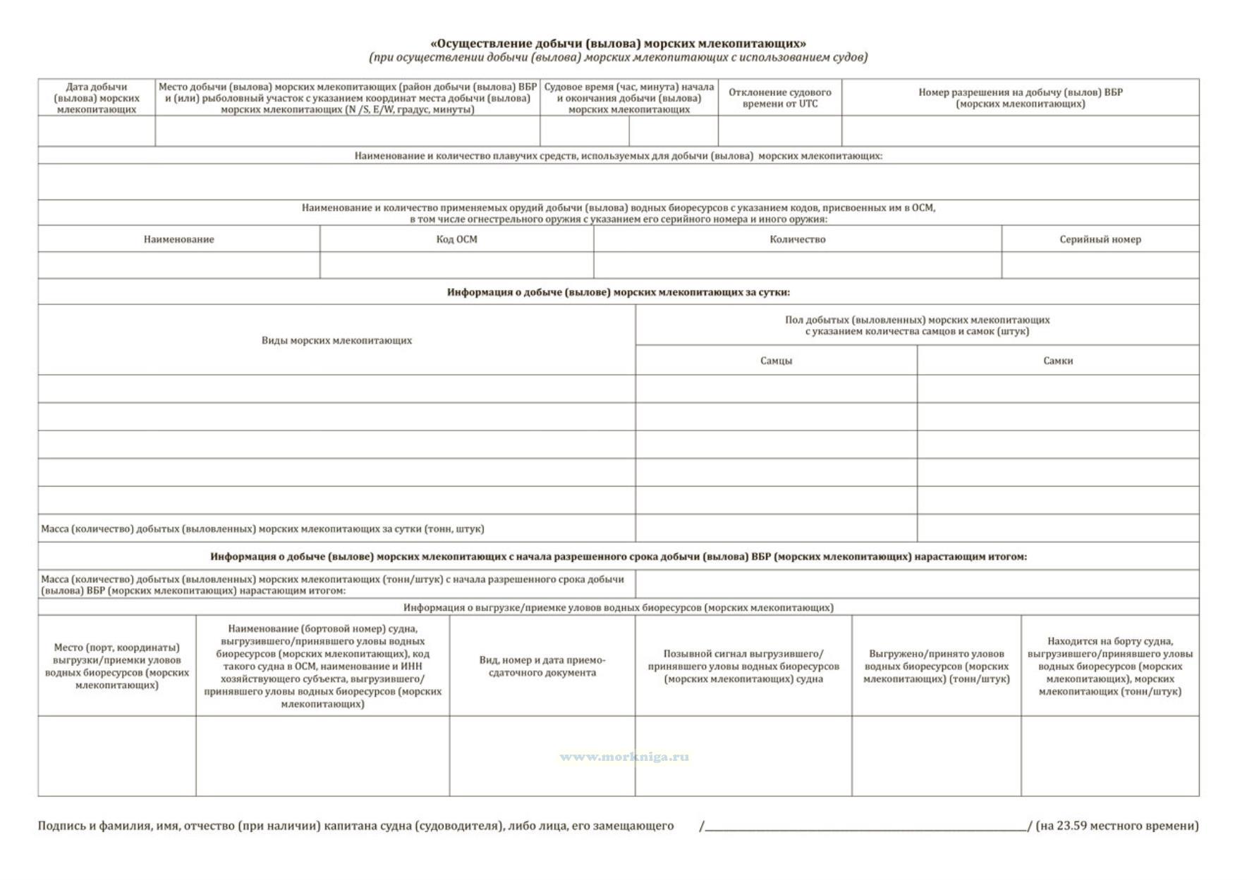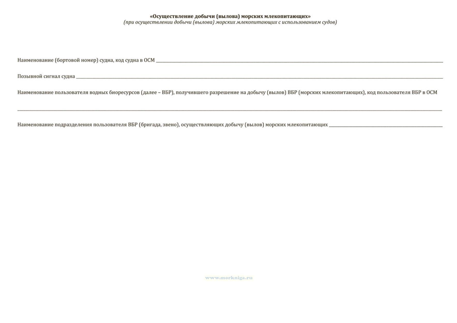 При осуществлении добычи (вылова) морских млекопитающих с использованием судов рыболовный журнал должен включать раздел "Осуществление добычи (вылова) морских млекопитающих".