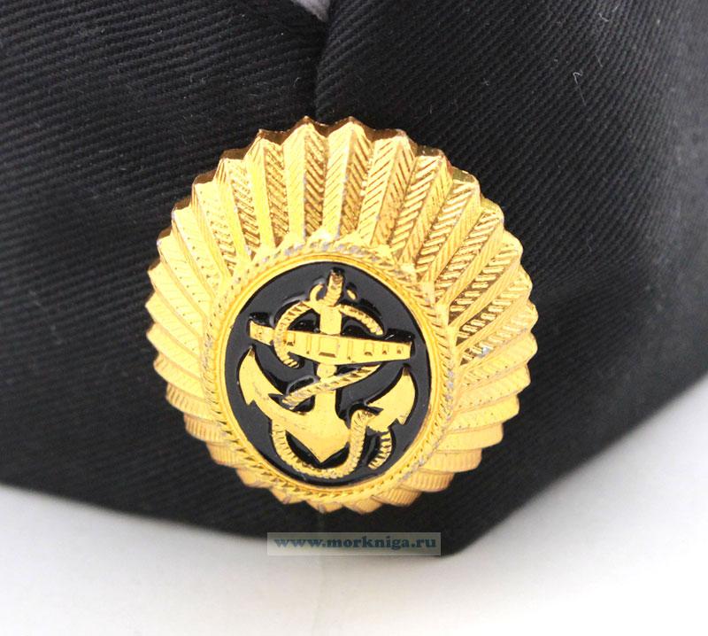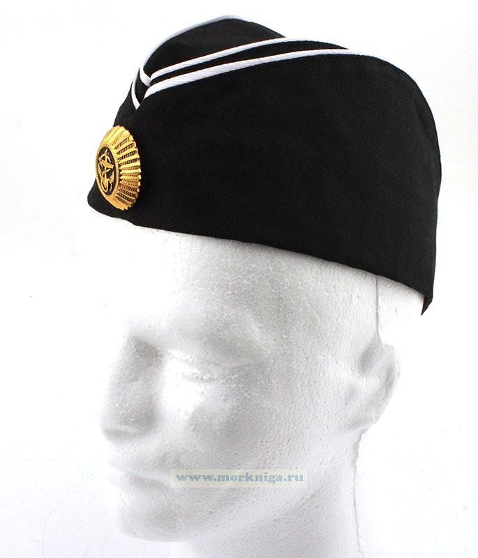 Пилотка военнослужащего ВМФ хлопчатобумажная, с двумя вставками белого цвета и золотистой кокардой.