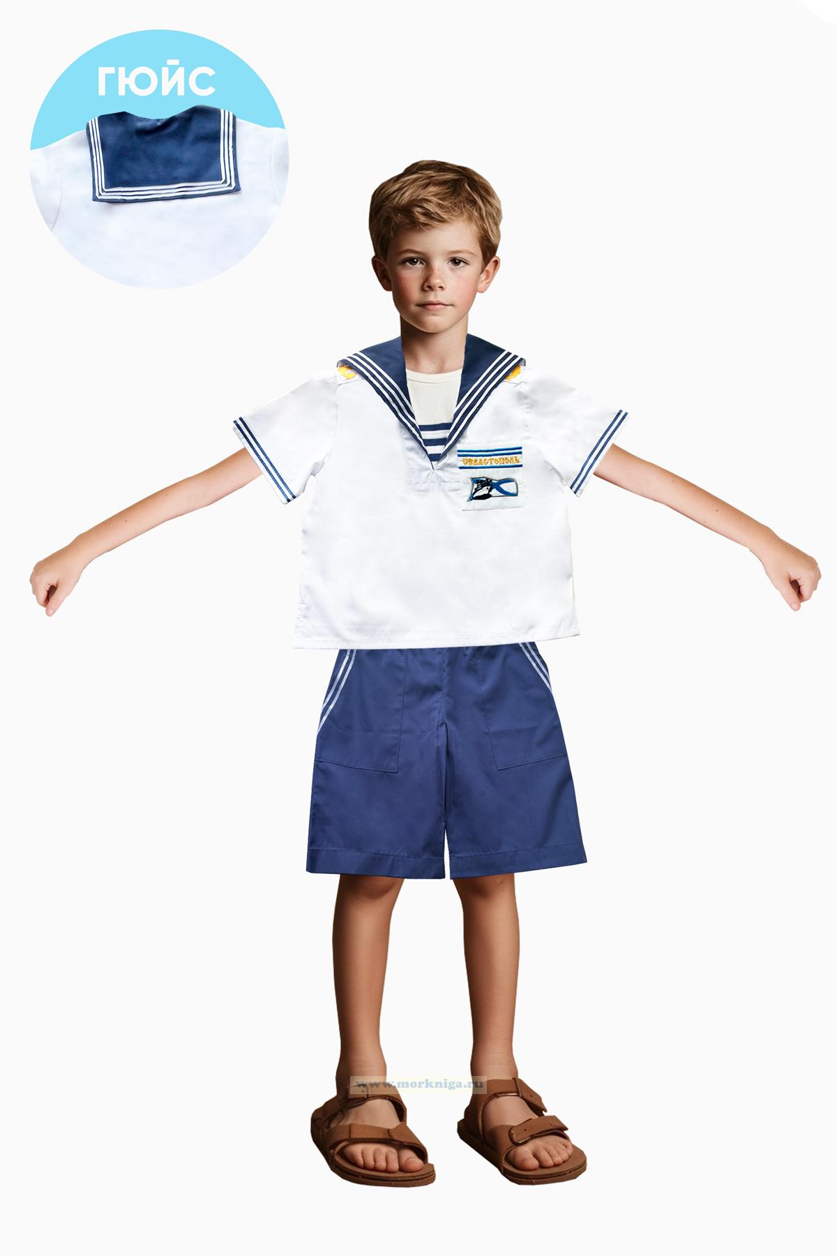 Костюм состоит из двух частей: рубашка с пришитым гюйсом и вставкой-обманкой «тельняшка»; шорты.