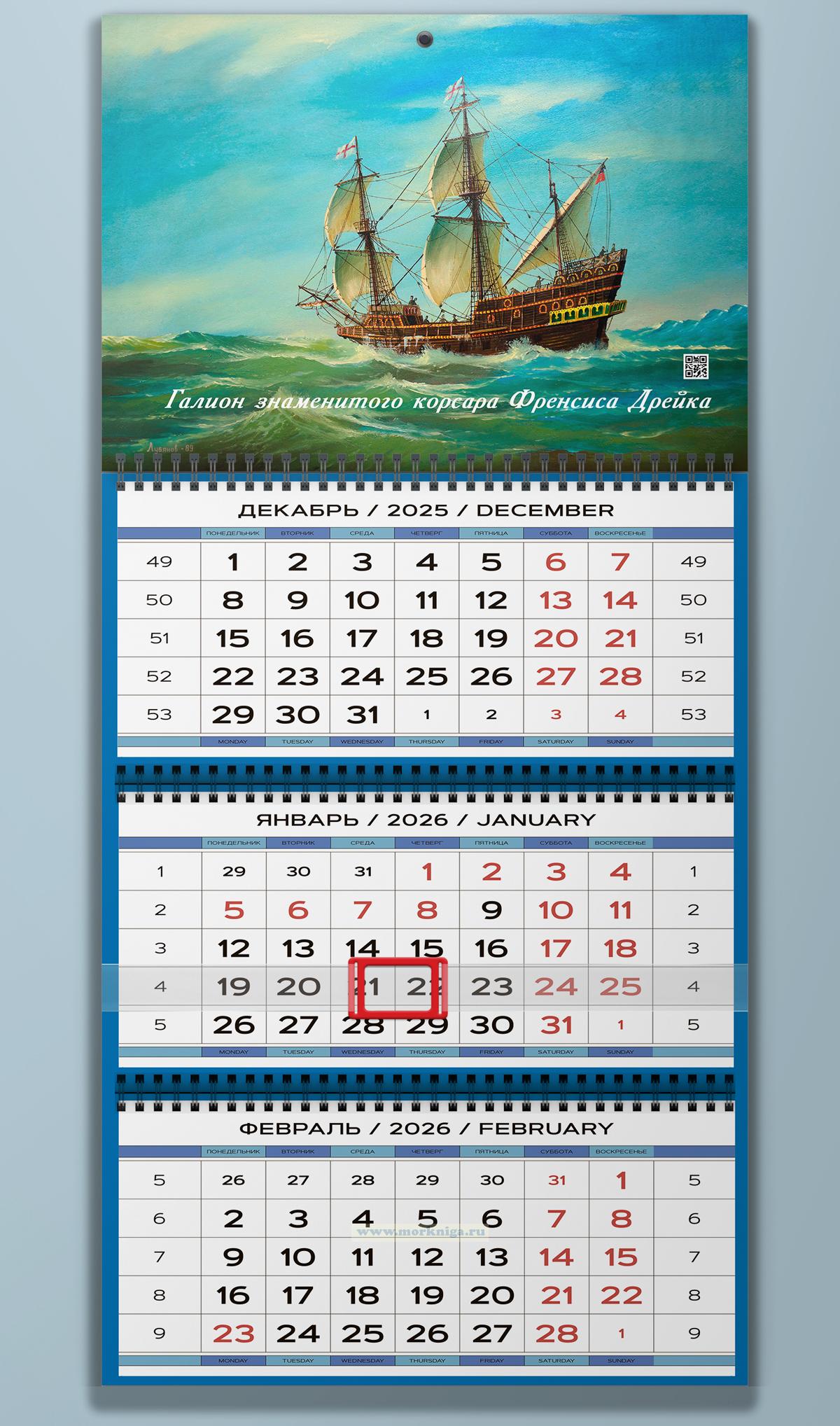Квартальный календарь - чрезвычайно удобная версия настенного календаря. Позволяет видеть одновременно календарные сетки трех месяцев: текущего, предыдущего и следующего. Настенные квартальные календари идеально подходят для планирования. Важные даты можно отмечать прямо на календаре. На обложке изображена картина художника-мариниста Андрея Лубянова "Галион знаменитого корсара Френсиса Дрейка"