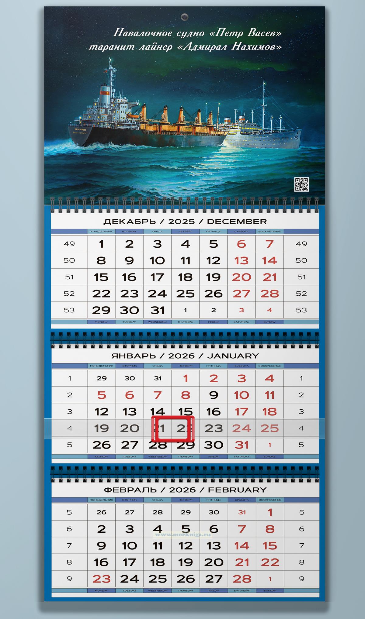 Квартальный календарь - чрезвычайно удобная версия настенного календаря. Позволяет видеть одновременно календарные сетки трех месяцев: текущего, предыдущего и следующего. Настенные квартальные календари идеально подходят для планирования. Важные даты можно отмечать прямо на календаре. На обложке изображена картина художника-мариниста Андрея Лубянова "Навалочное судно "Петр Васев" таранит лайнер "Адмирал Нахимов""