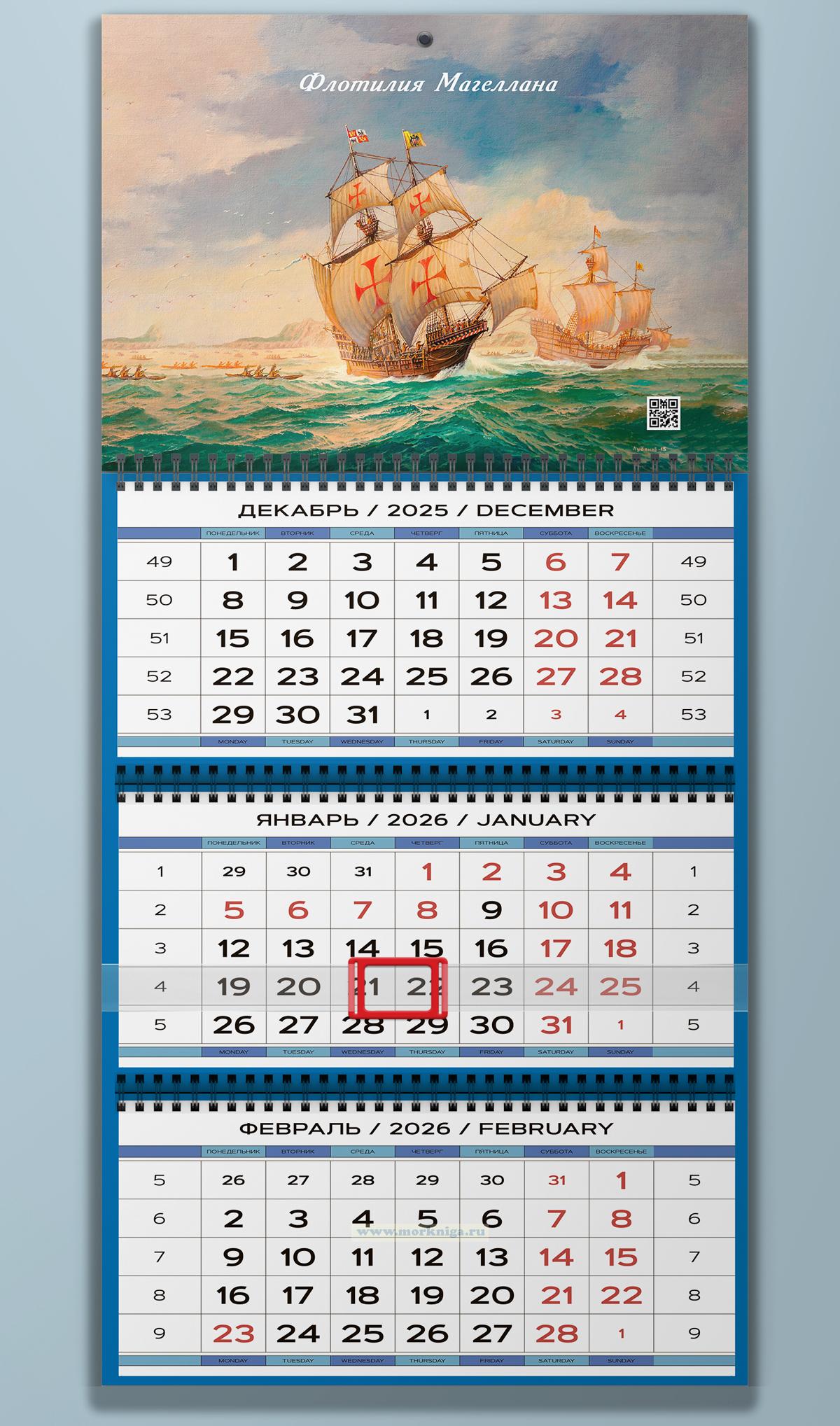 Квартальный календарь - чрезвычайно удобная версия настенного календаря. Позволяет видеть одновременно календарные сетки трех месяцев: текущего, предыдущего и следующего. Настенные квартальные календари идеально подходят для планирования. Важные даты можно отмечать прямо на календаре. На обложке изображена картина художника-мариниста Андрея Лубянова "Флотилия Магеллана"