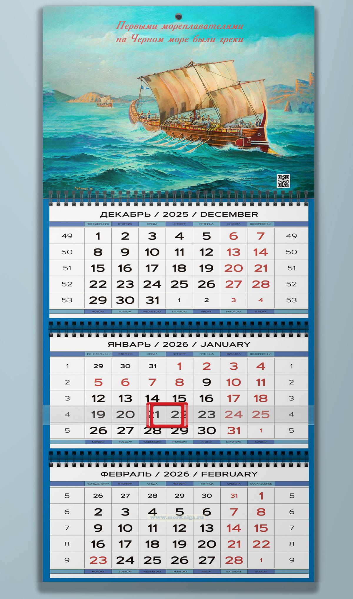 Квартальный календарь - чрезвычайно удобная версия настенного календаря. Позволяет видеть одновременно календарные сетки трех месяцев: текущего, предыдущего и следующего. Настенные квартальные календари идеально подходят для планирования. Важные даты можно отмечать прямо на календаре. На обложке изображена картина художника-мариниста Андрея Лубянова "Первыми мореплавателями на Черном море были греки"