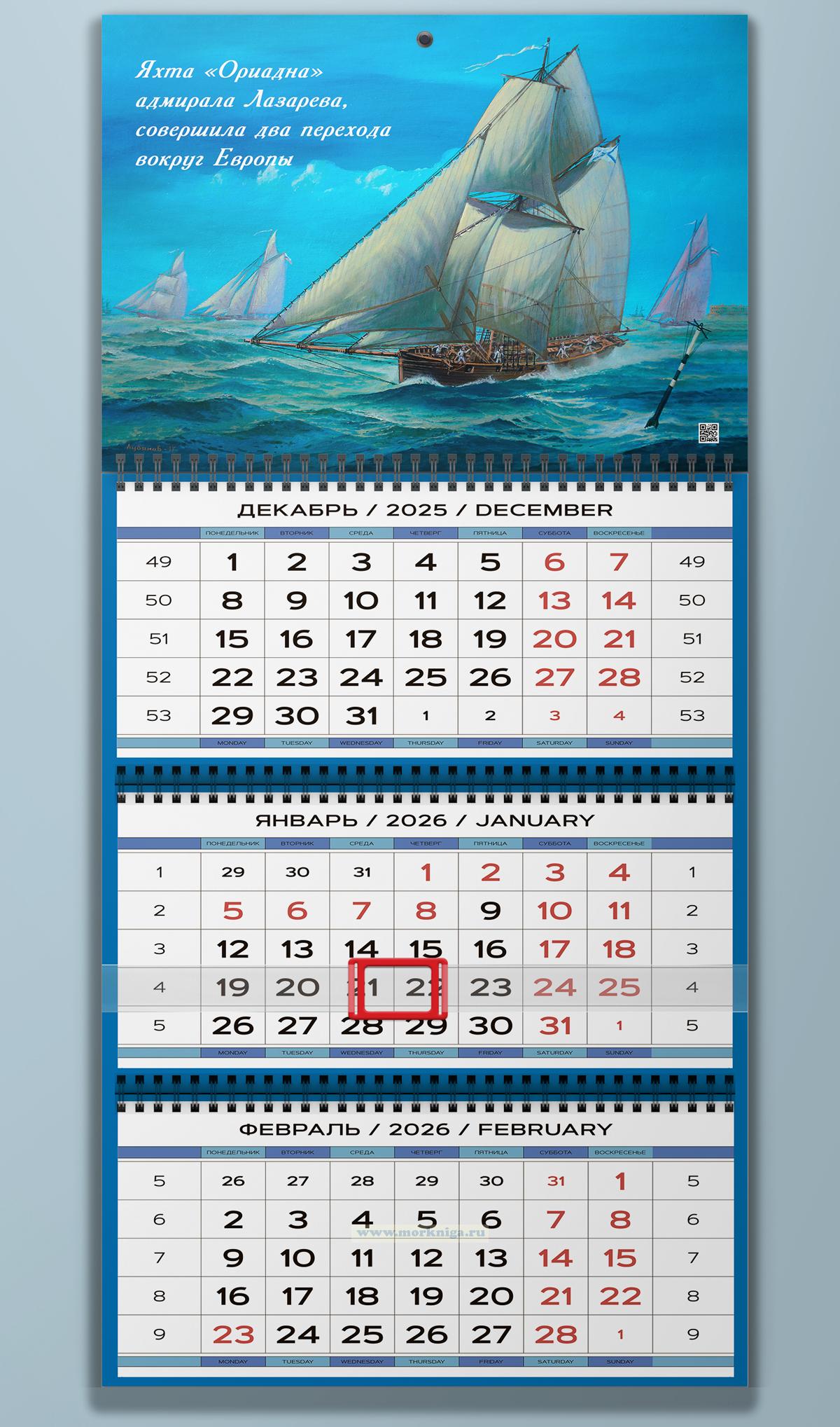 Квартальный календарь - чрезвычайно удобная версия настенного календаря. Позволяет видеть одновременно календарные сетки трех месяцев: текущего, предыдущего и следующего. Настенные квартальные календари идеально подходят для планирования. Важные даты можно отмечать прямо на календаре. На обложке изображена картина художника-мариниста Андрея Лубянова "Яхта "Ориадна" адмирала Лазарева, совершила два перехода вокруг Европы"