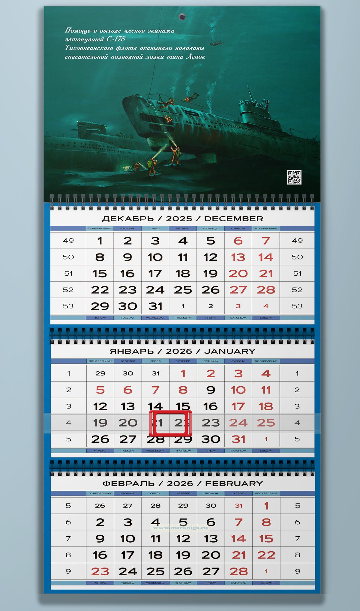 Календарь квартальный "Помощь в выходе членов экипажа затонувшей С-178 Тихоокеанского флота оказывали водолазы спасательной подводной лодки типа Ленок" на 2026 год
