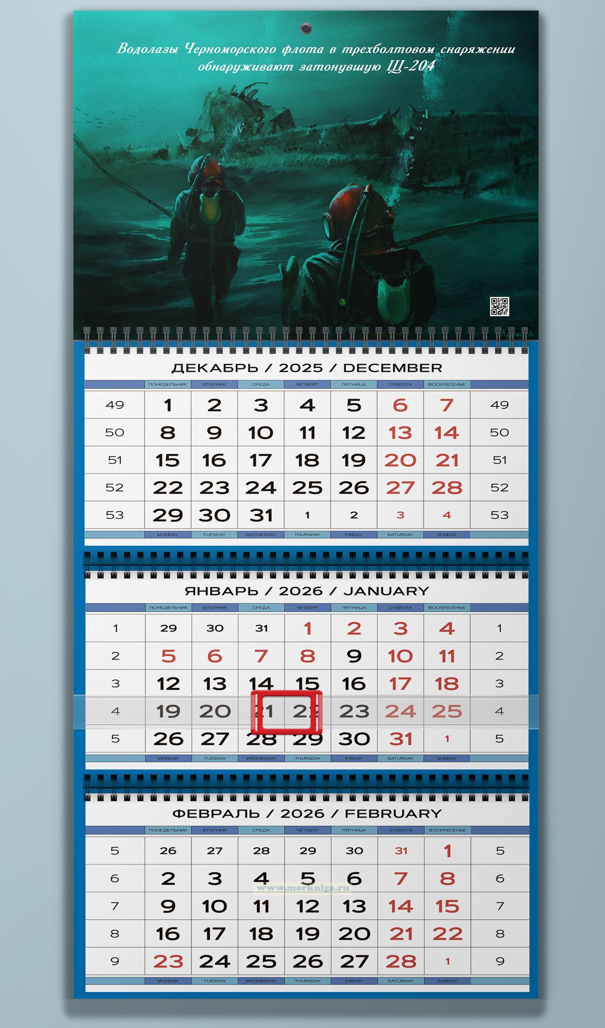 Квартальный календарь - чрезвычайно удобная версия настенного календаря. Позволяет видеть одновременно календарные сетки трех месяцев: текущего, предыдущего и следующего. Настенные квартальные календари идеально подходят для планирования. Важные даты можно отмечать прямо на календаре. На обложке изображена картина художника-мариниста Андрея Лубянова "Водолазы Черноморского флота в трехболтовом снаряжении обнаруживают затонувшую Щ-204"