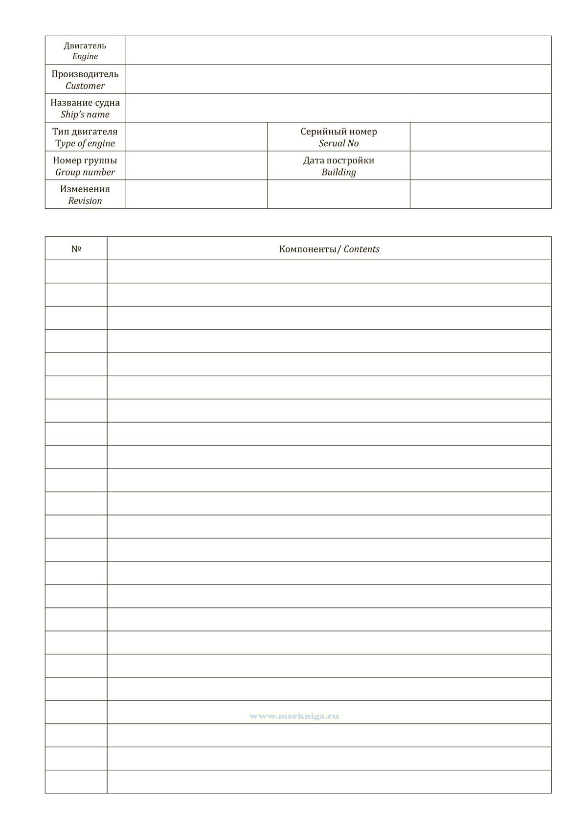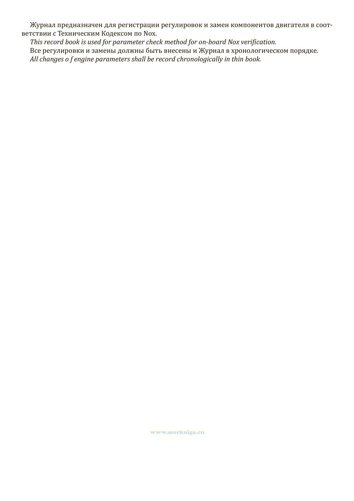 Журнал на русском и английском языках. Журнал предназначен для регистрации регулировок и замен компонентов двигателя в соответствии с Техническим Кодексом по Nох. Все регулировки и замены должны быть внесены и Журнал в хронологическом порядке. This record book is used for parameter check method for on-board Nox verification. Аll changes о f engine parameters shall be record chronologically in thin book. Журнал регистрации конструктивных изменений имеет графы: Record Book of Engine Parameters consists of columns: Двигатель/Engine Производитель/Customer Название судна/Ship’s name Тип двигателя/Type of engine Серийный номер/Serial No. Номер группы/Group number Дата постройки/Building Изменения/Revision 1. № 2. Компоненты/Contents
