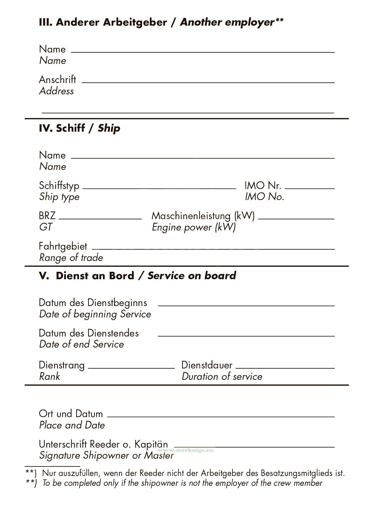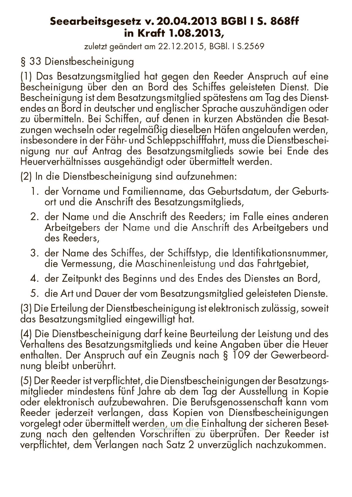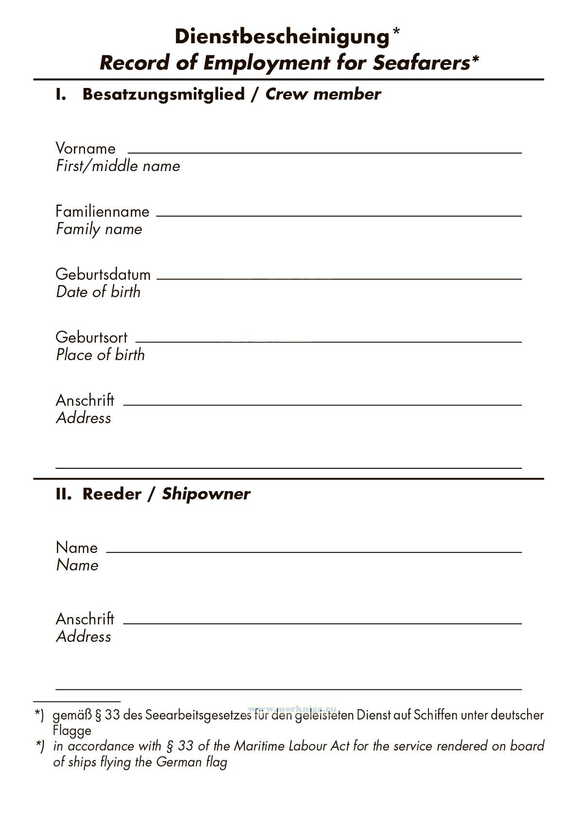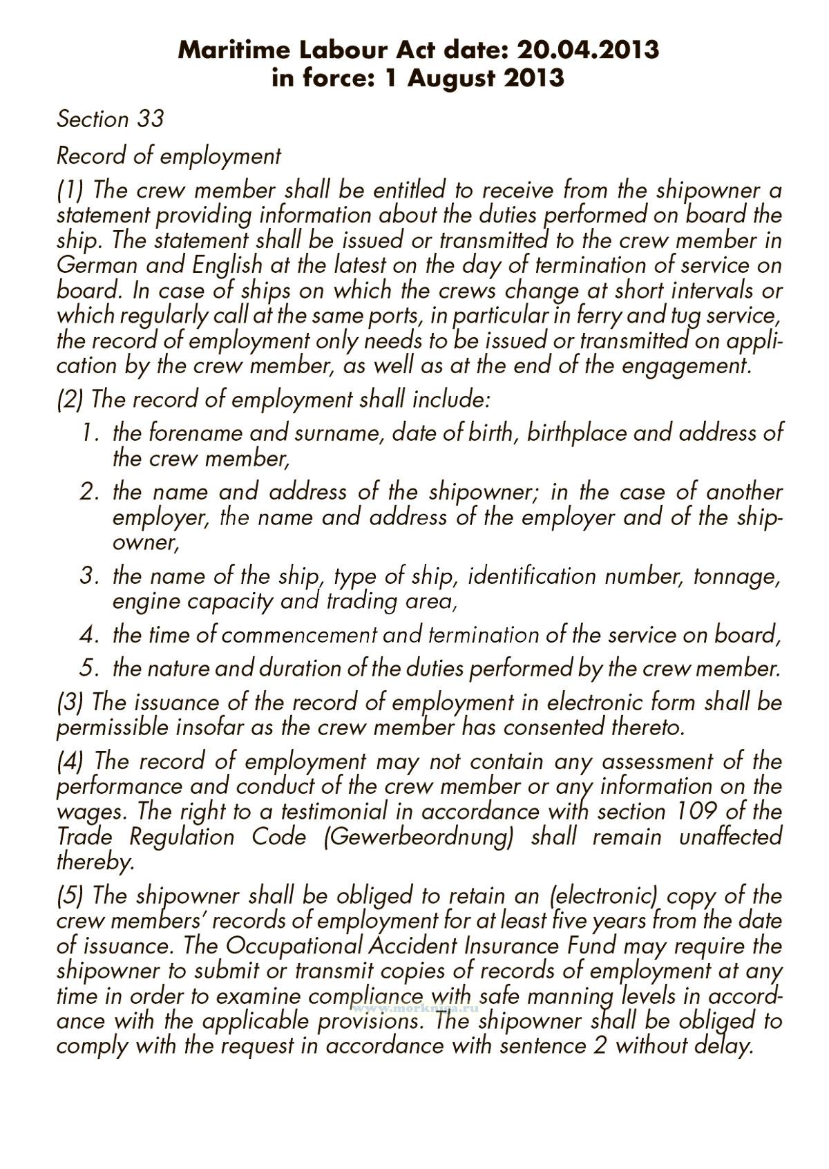 The crew member shall be entitled to receive from the shipowner a statement providing information about the duties performed on board the ship. The statement shall be issued or transmitted to the crew member in German and English at the latest on the day of termination of service on board. In case of ships on which the crews change at short intervals or which regularly call at the same ports, in particular in ferry and tug service, the record of employment only needs to be issued or transmitted on application by the crew member, as well as at the end of the engagement.