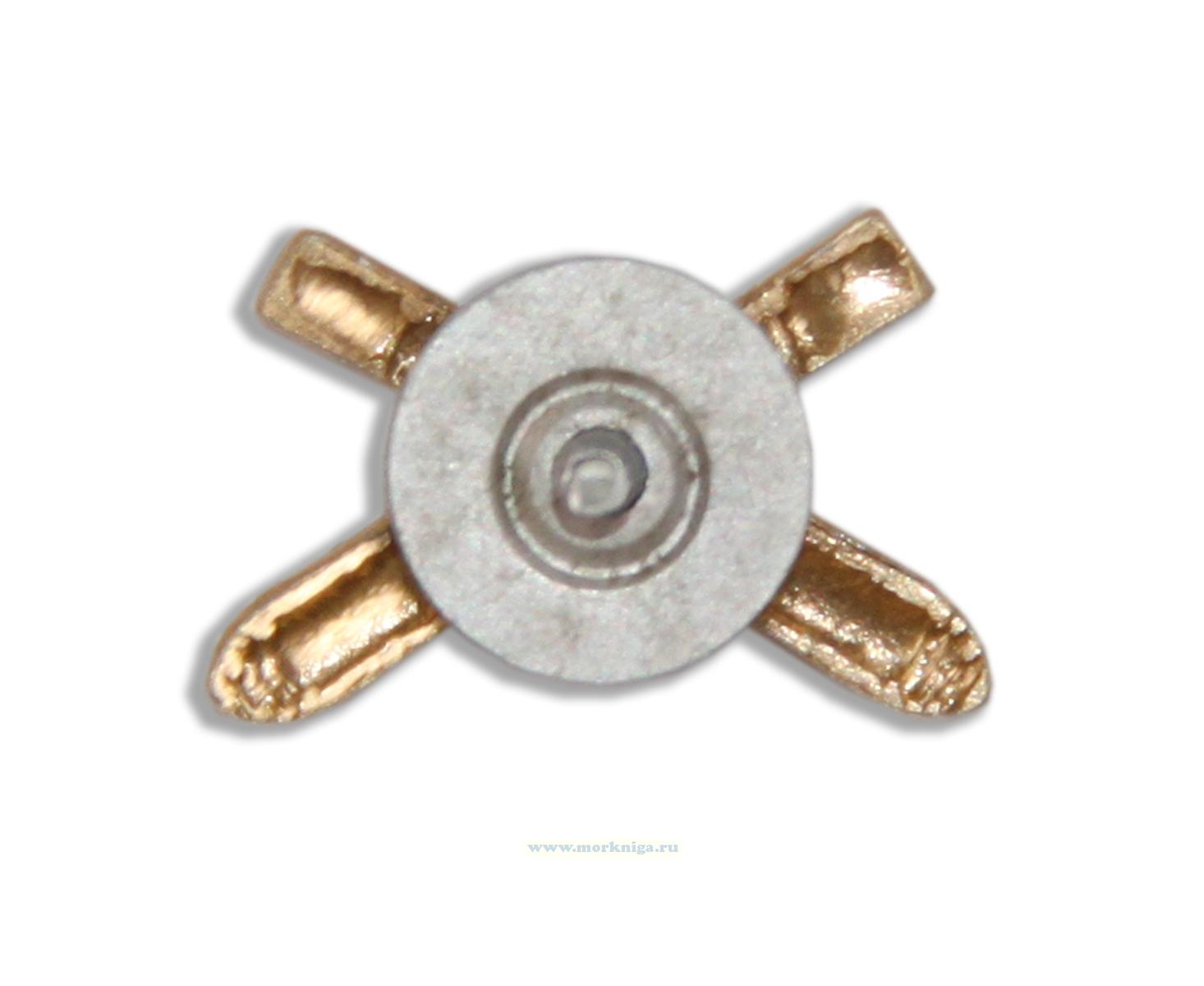 Знак различия по функциональному предназначению военнослужащих Ракетных войск и артиллерии Вооруженных Сил изготавливался из металла золотистого цвета для повседневной военной формы одежды.