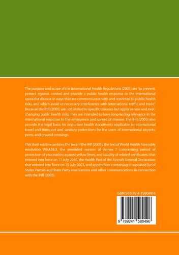 The book is dedicated to the International Sanitary Regulations (IHR), which are managed by the World Health Organization (WHO). She describes the historical development of these regulations, starting with their initial adoption in 1969 and subsequent changes caused by new health threats and increased international travel and trade.