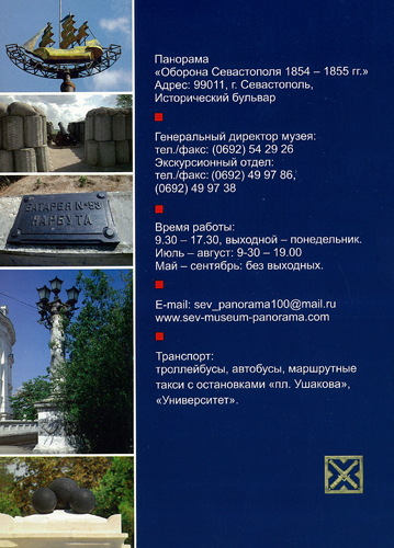 Путеводитель содержит информацию о всемирно известной, единственной в Украине Панораме "Оборона Севастополя 1854-1855 гг.", знакомит с музейной экспозицией, предваряющей осмотр произведения батальной живописи. Путеводитель также дает необходимые сведения для самостоятельного осмотра памятников Исторического бульвара, где расположена Панорама.