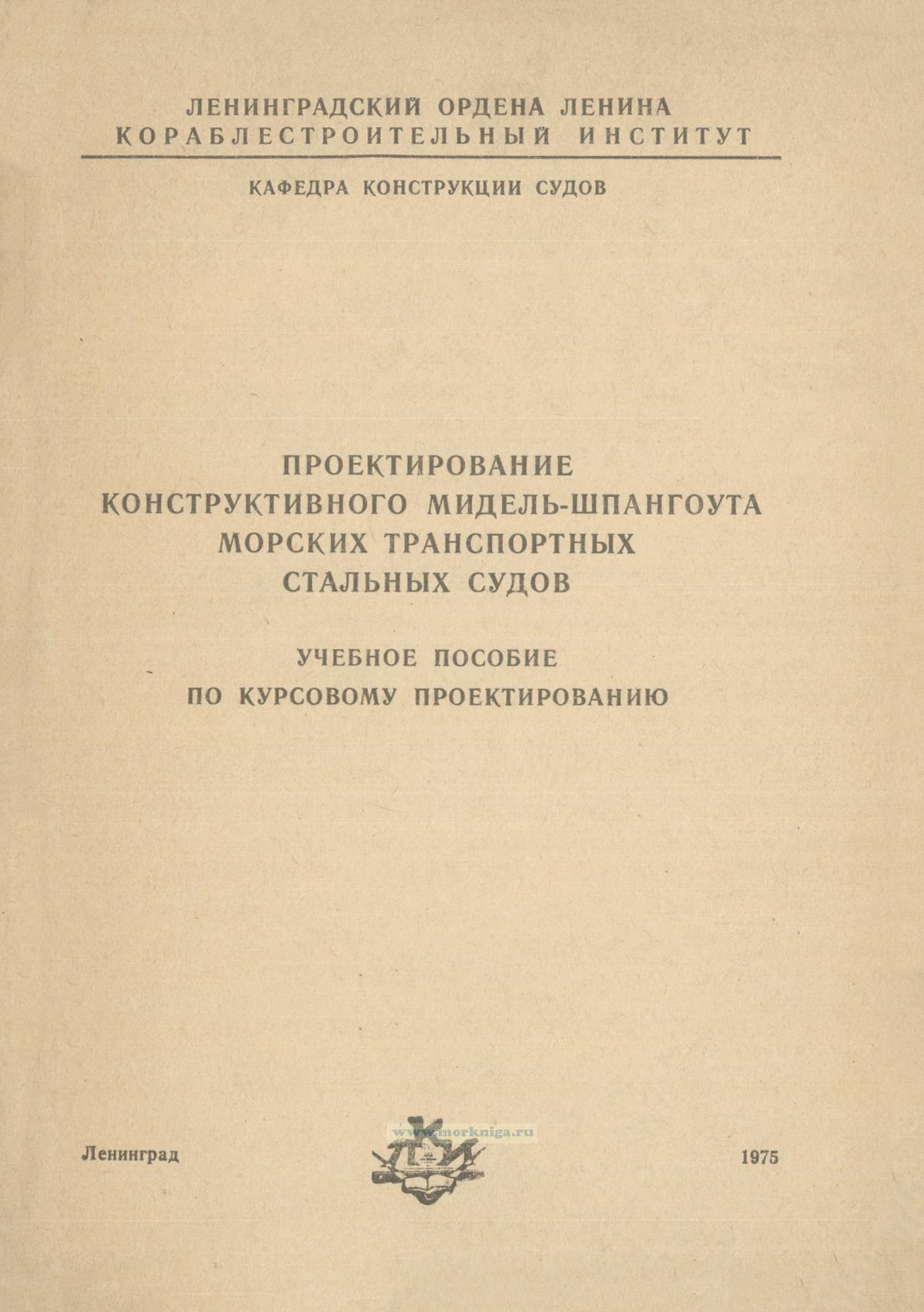 В учебном пособии доложены основные требования Правил классификации и постройке морских стальных судов Регистра СССР по проектированию конструктивных мидель-шпангоутов сухогрузных и наливных судов (включая переборки) и даны к ним необходимые разъяснения. Учебное пособие содержит методические рекомендации к проектно-конструкторской работе. Оно предназначено для выполнения курсового проекта по курсу "Конструкция корпуса морских судов" студентами кораблестроительного, инженерно-экономического, вечернего и заочного факультетов Ленинградского кораблестроительного института и может использоваться при дипломном проектировании по профилю выпускающих кафедр кораблестроительного факультета.